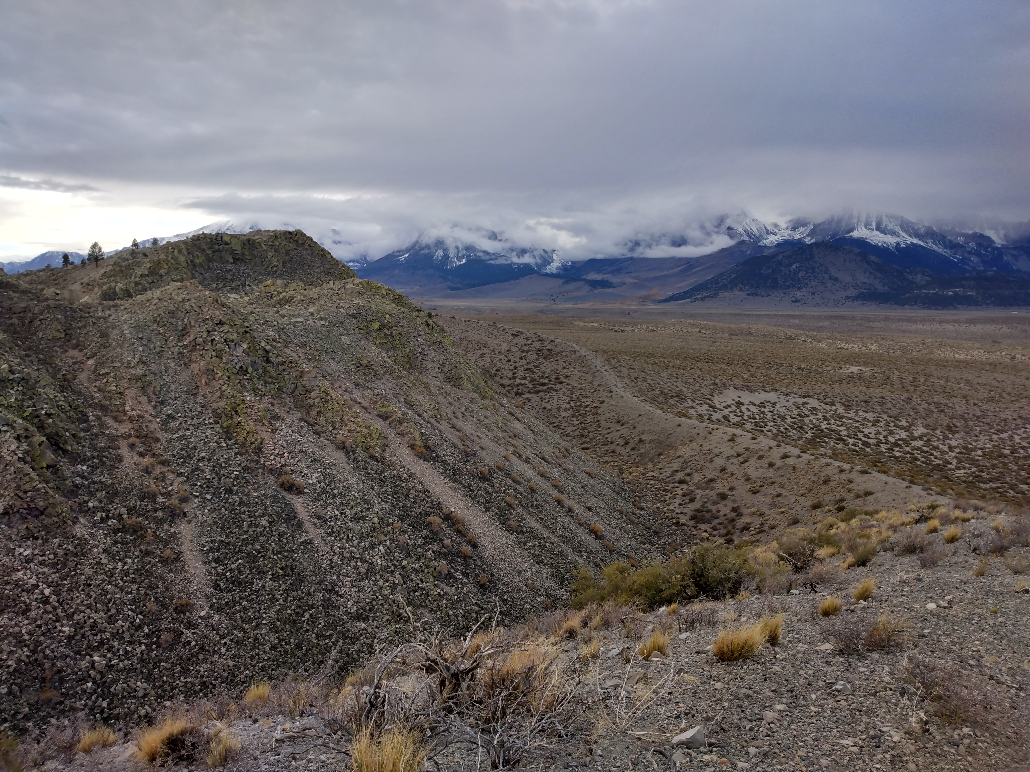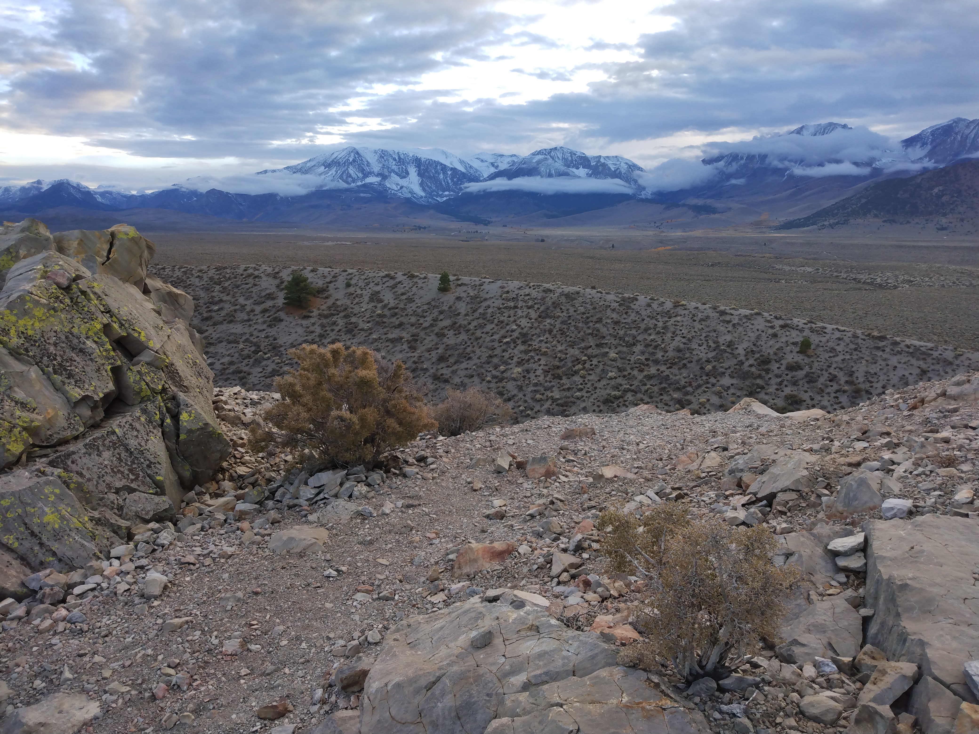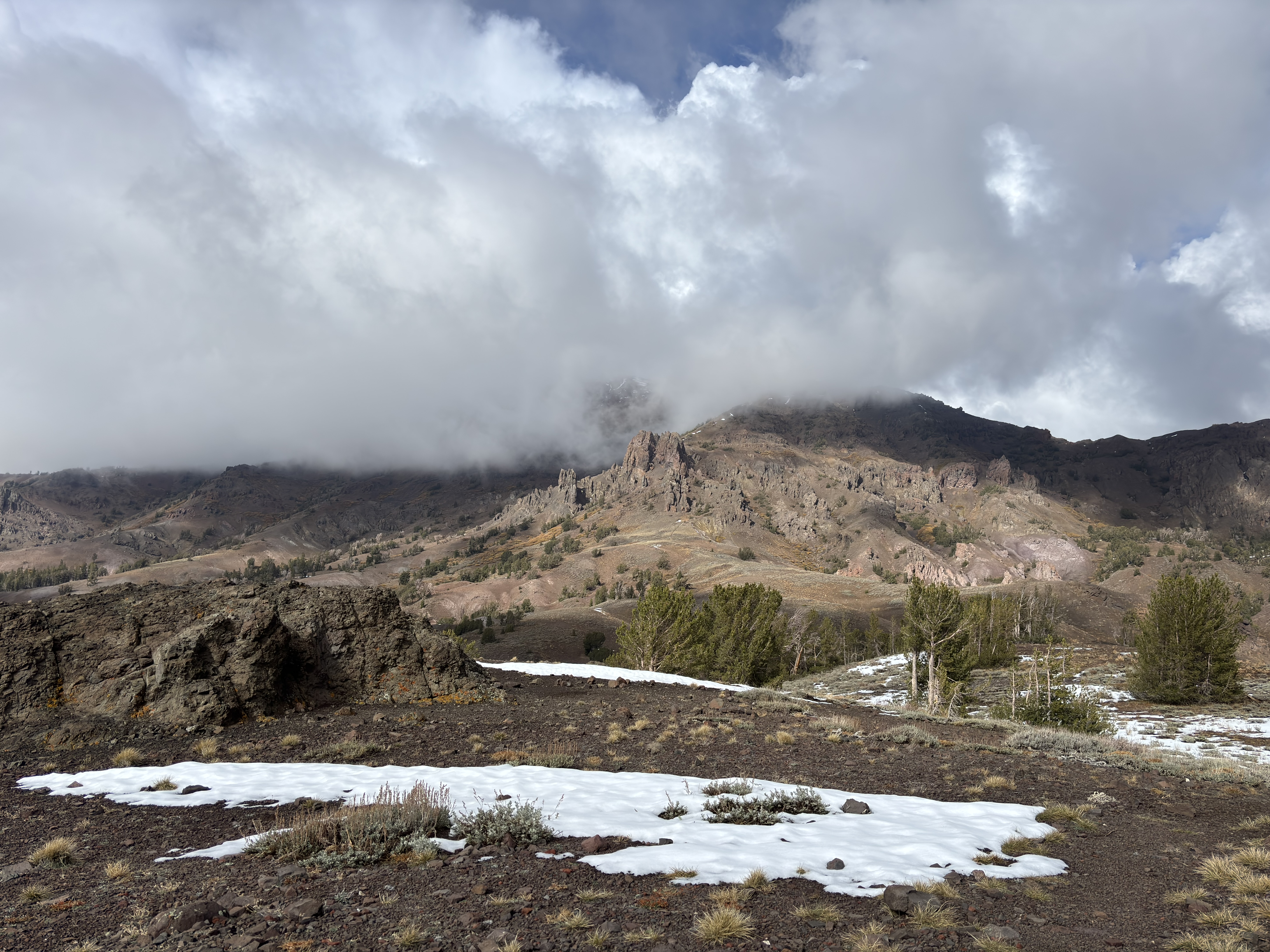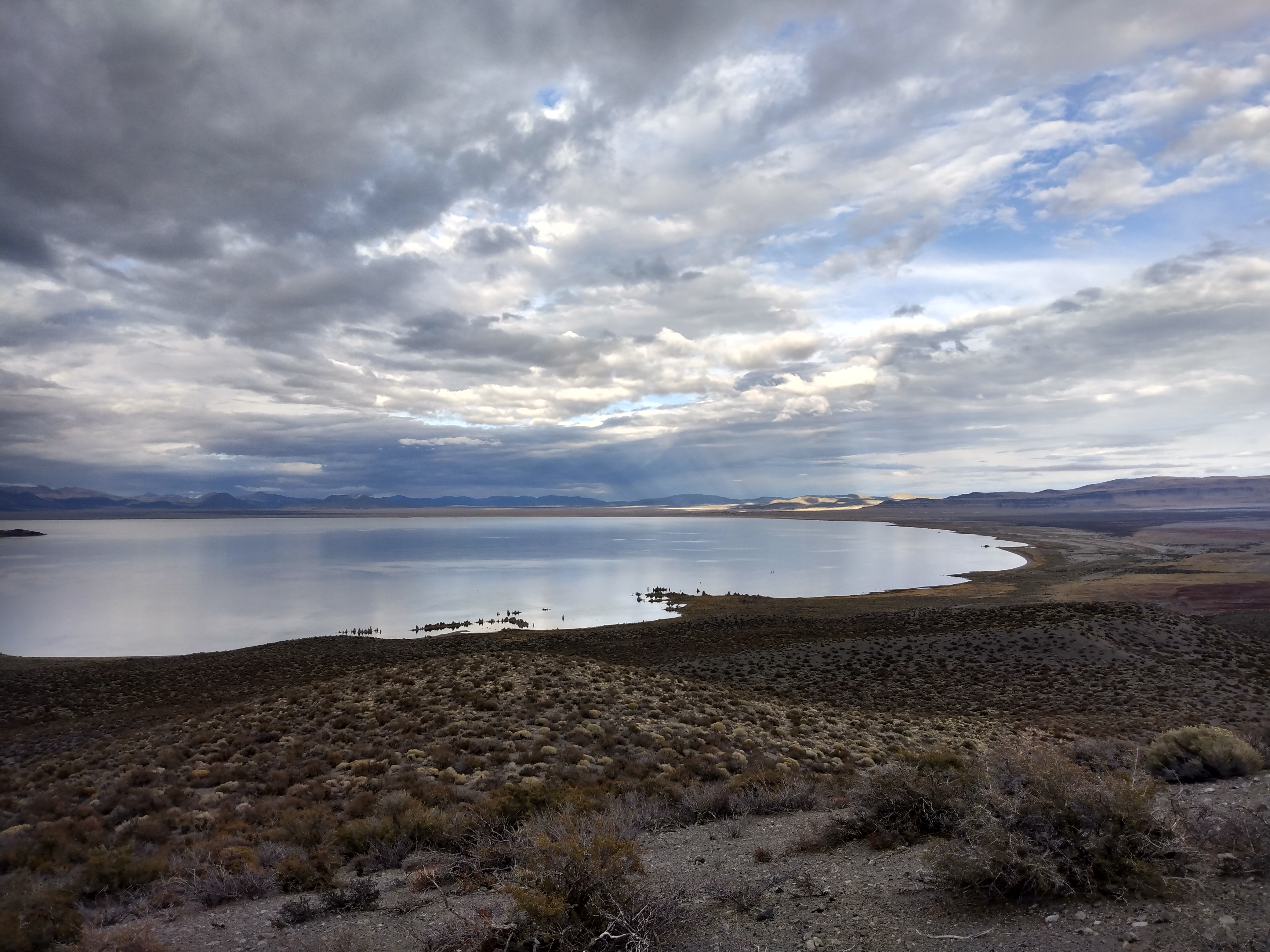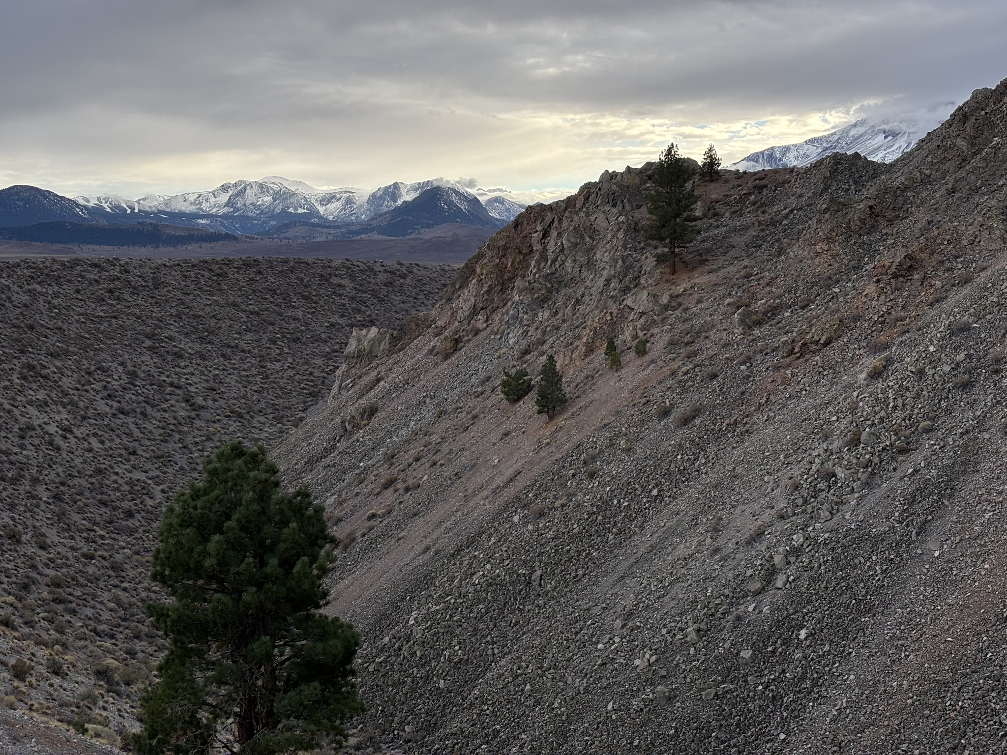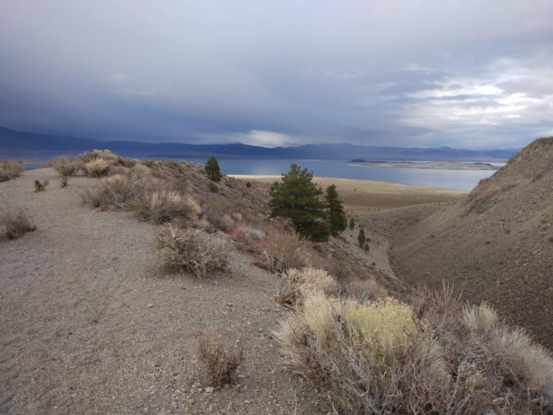 We head down 108 to 395, past the Marine Corps base and through Bridgeport. Around Mono Lake there's high overcast and no rain. We head for Panum Crater.