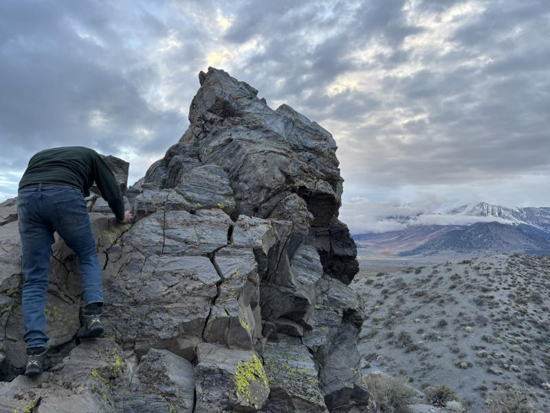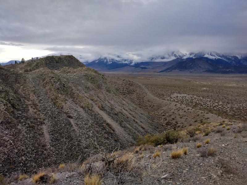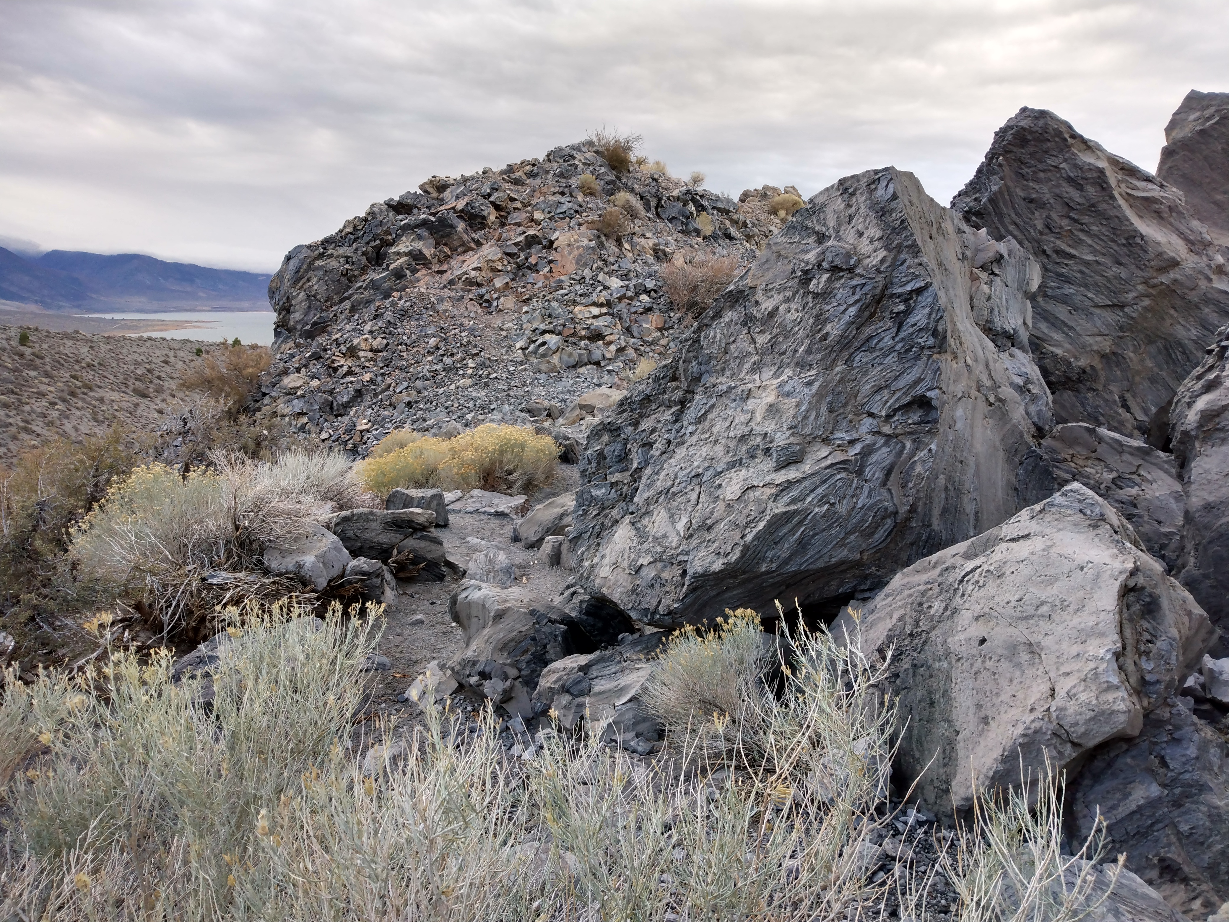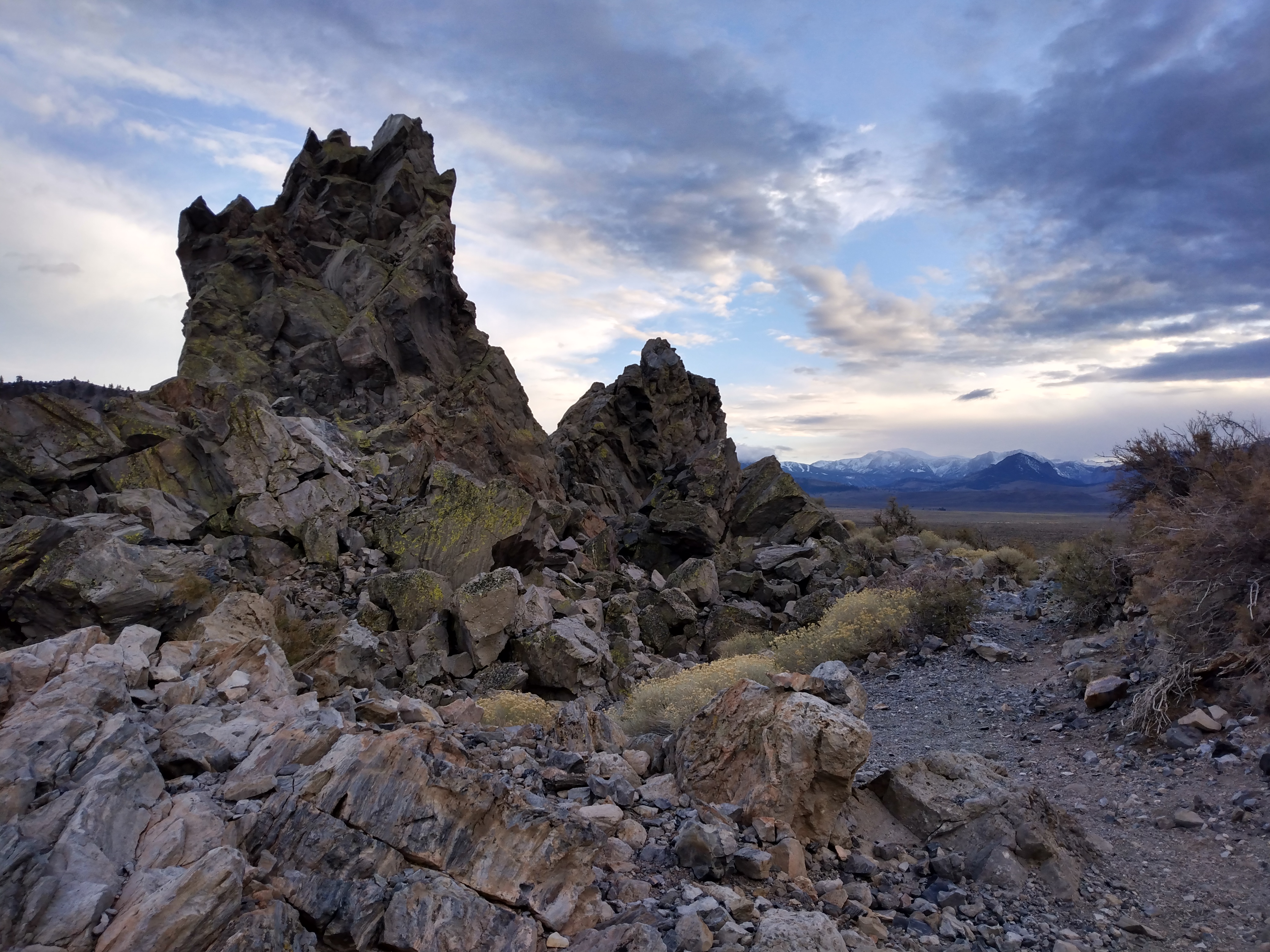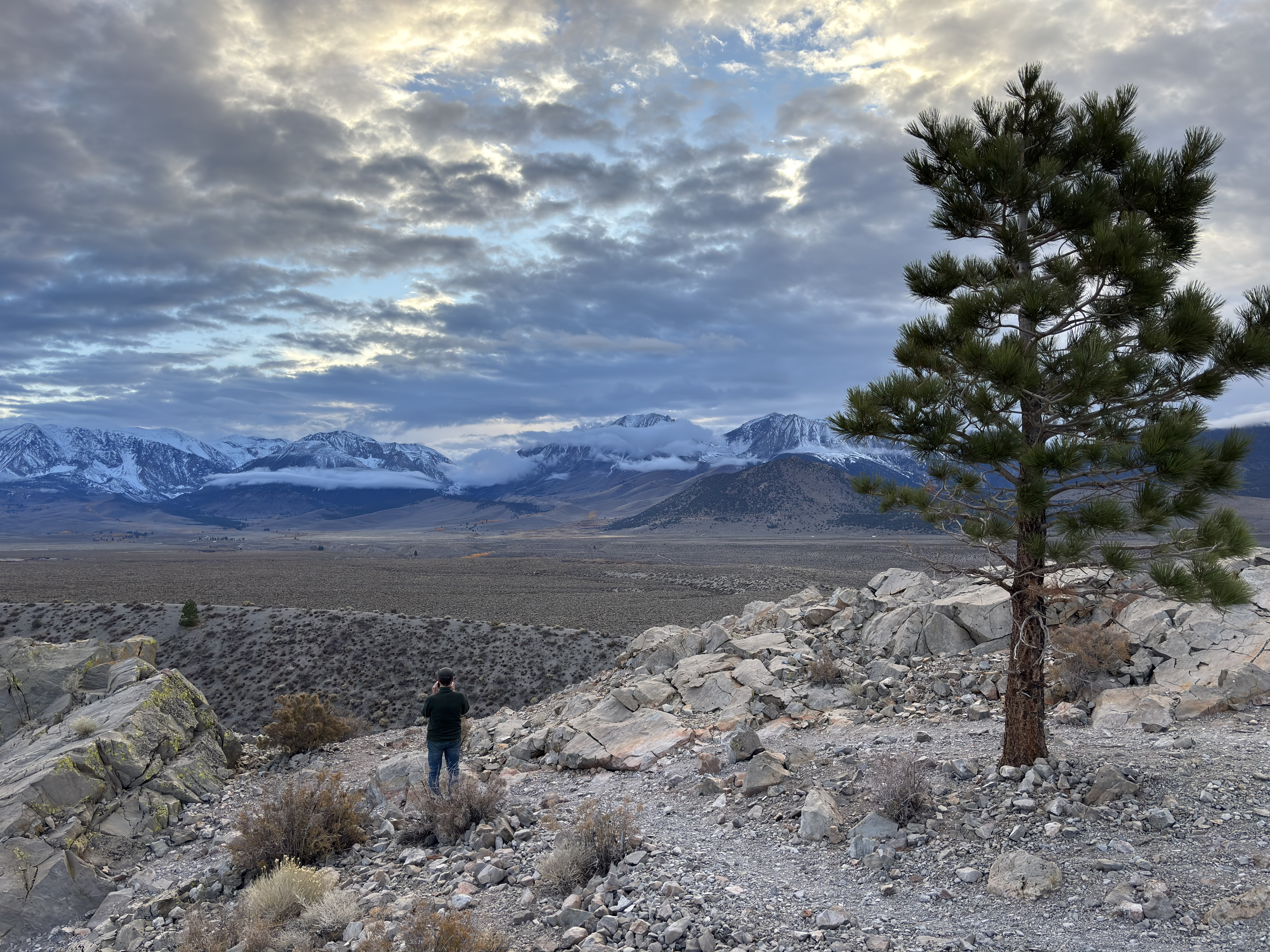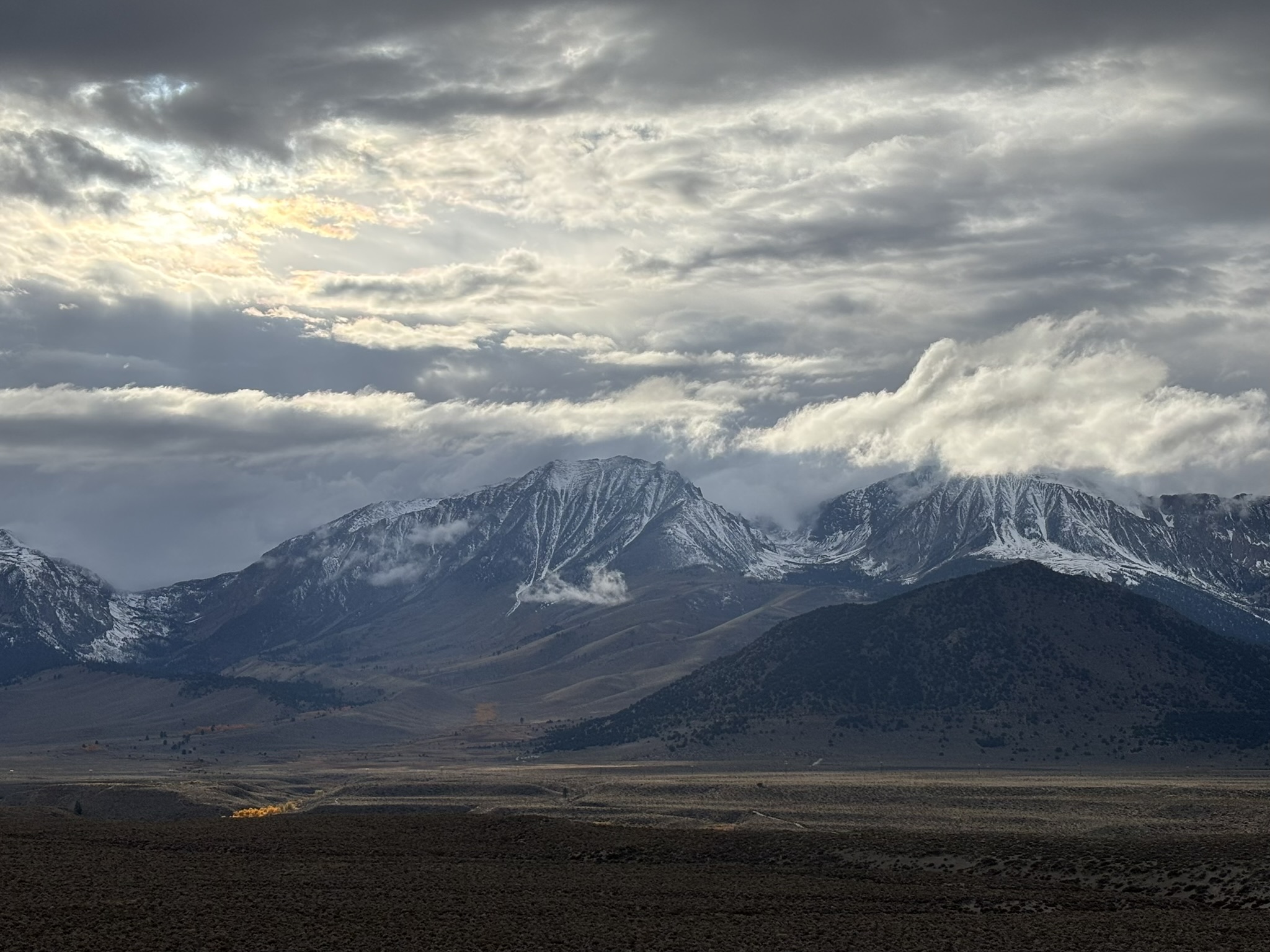 We head down 108 to 395, past the Marine Corps base and through Bridgeport. Around Mono Lake there's high overcast and no rain. We head for Panum Crater.