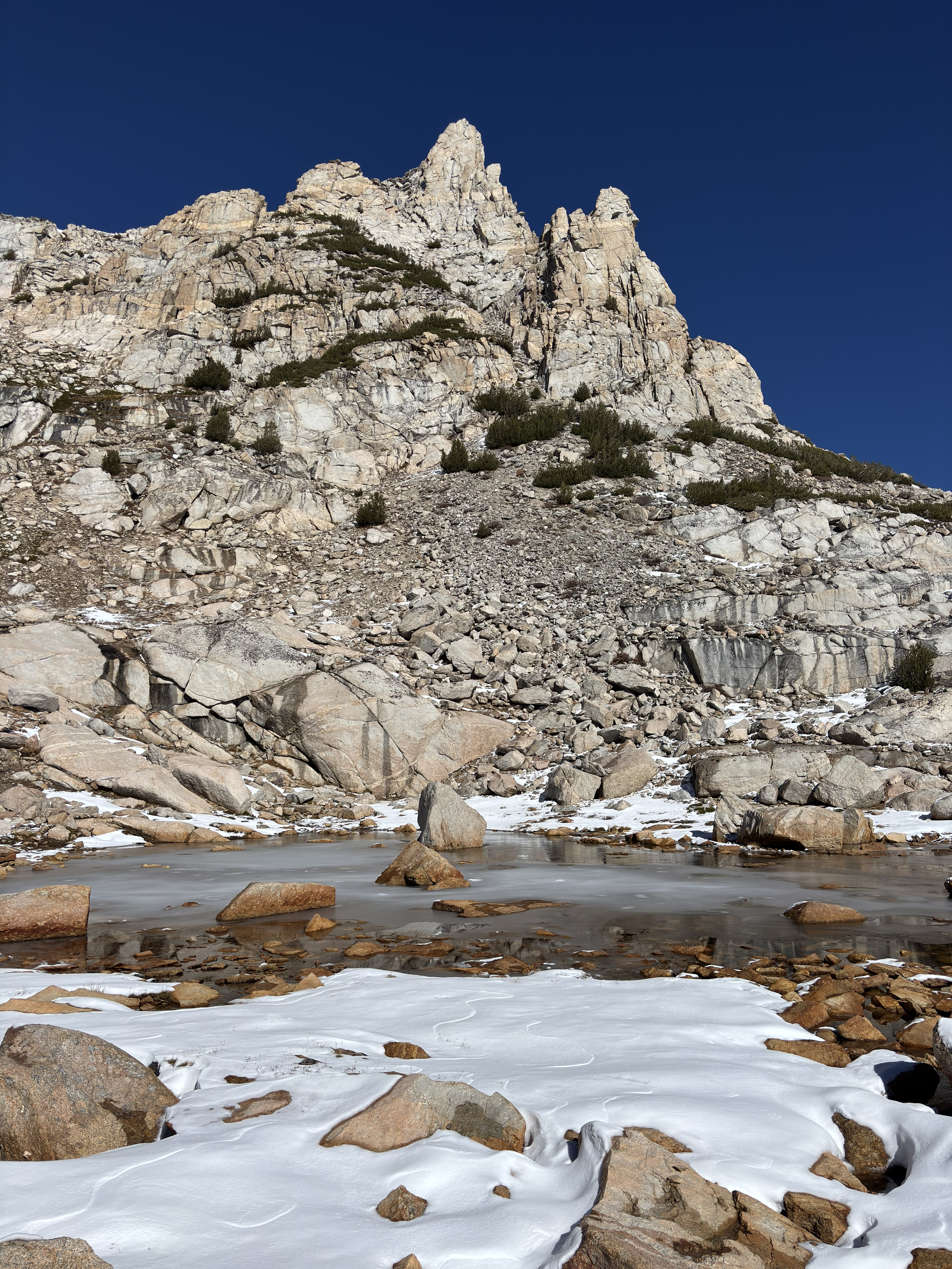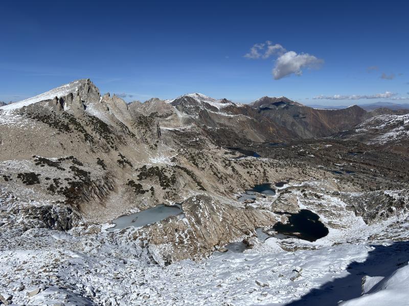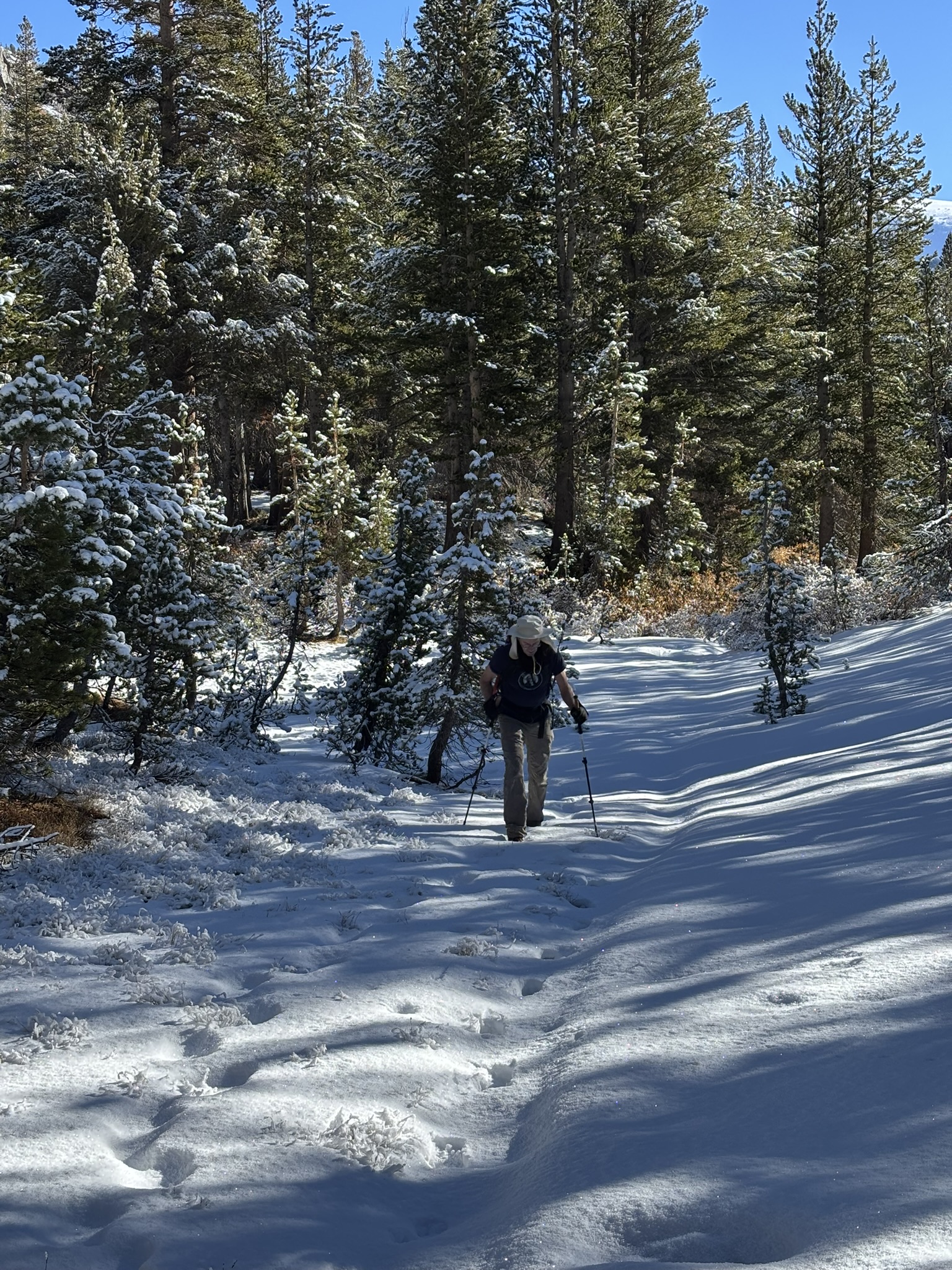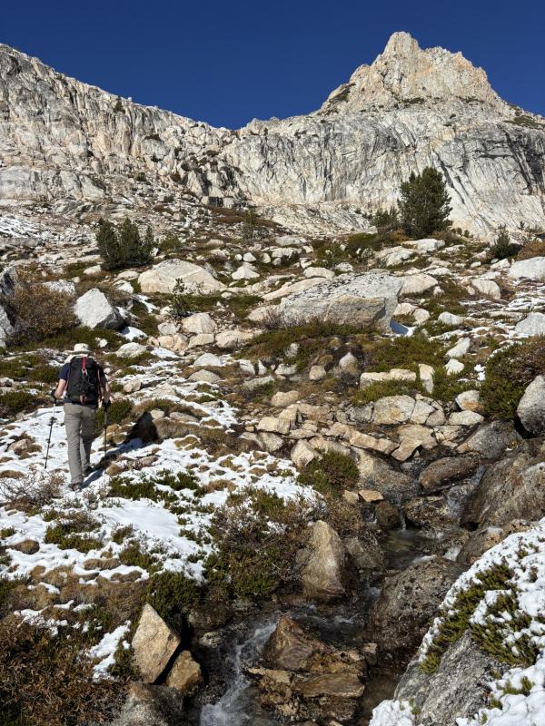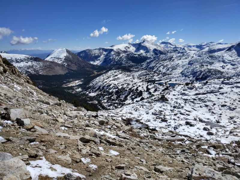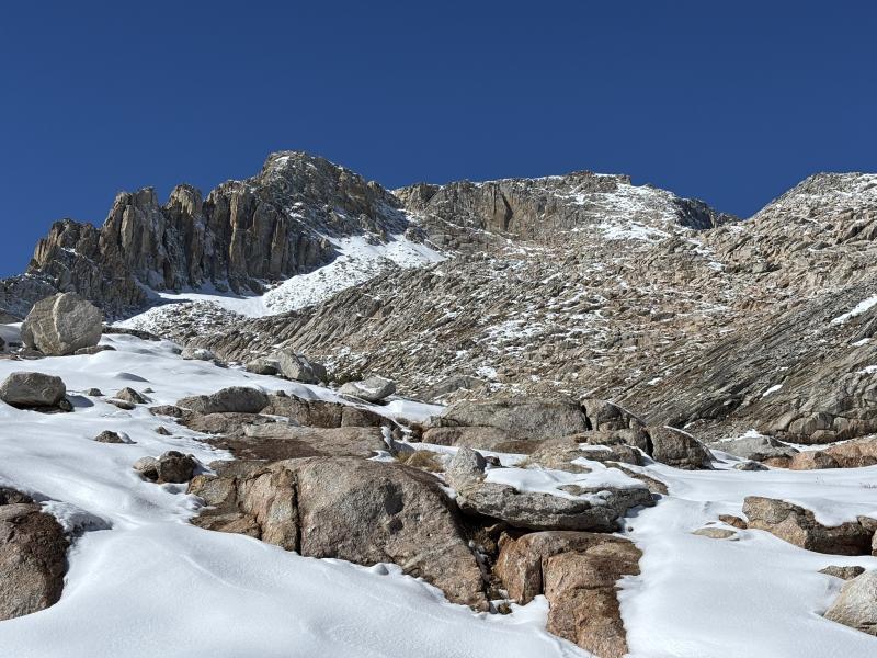On the minus side, I ran out of energy and couldn't summit. I could blame the snow, but my lack of conditioning and advancing age were probably bigger factors. If I try Conness again next fall, I'll a) do more training, e.g. stairmaster in the gym; b) acclimate at 10,000'+ for at least a day, preferably 2-3, and c) go a bit earlier to avoid snow: late Aug or early Sept.