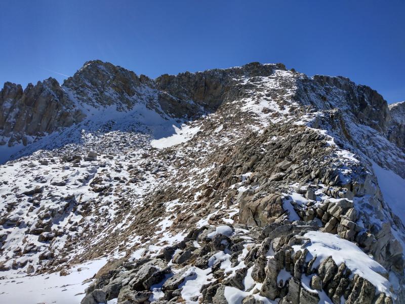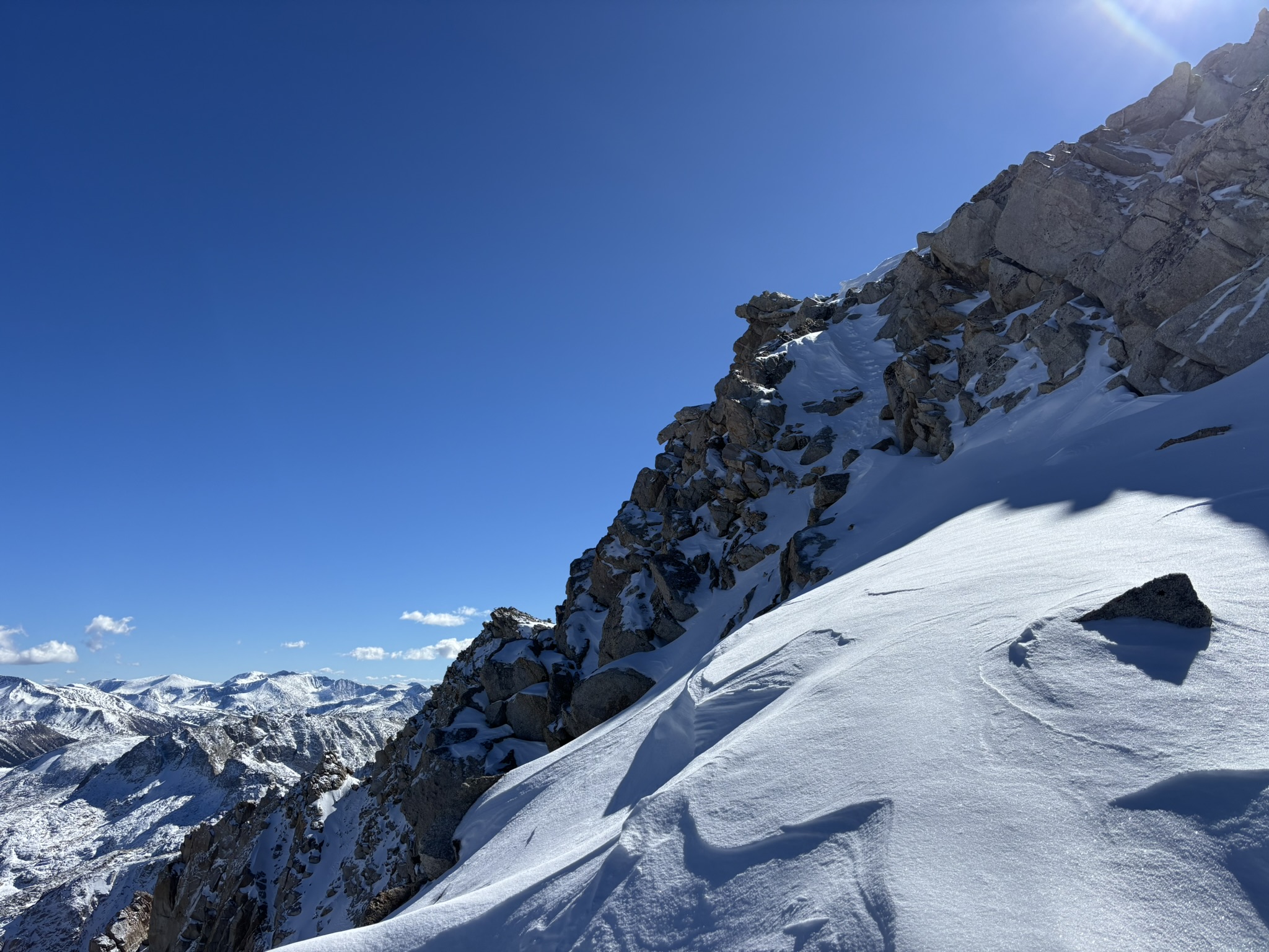 He arrives shortly after 3:00. He made it as far as the arete to the summit block, but turned around because of exhaustion and time concerns. There was deeper snow on the plateau, sometimes post-holing to hip level.
