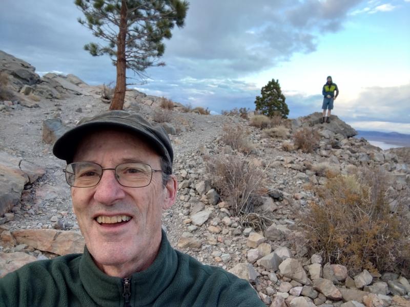 The cliffs below the peak are sunlit, but as we hike the sun goes away, clouds thicken, and we hear distant thunder. Then there's a nearby peal of thunder, and we hastily turn around.