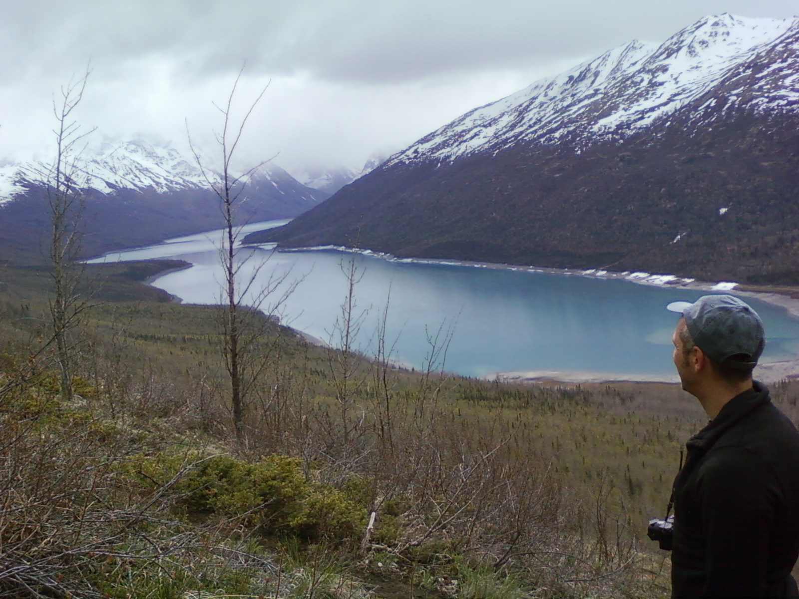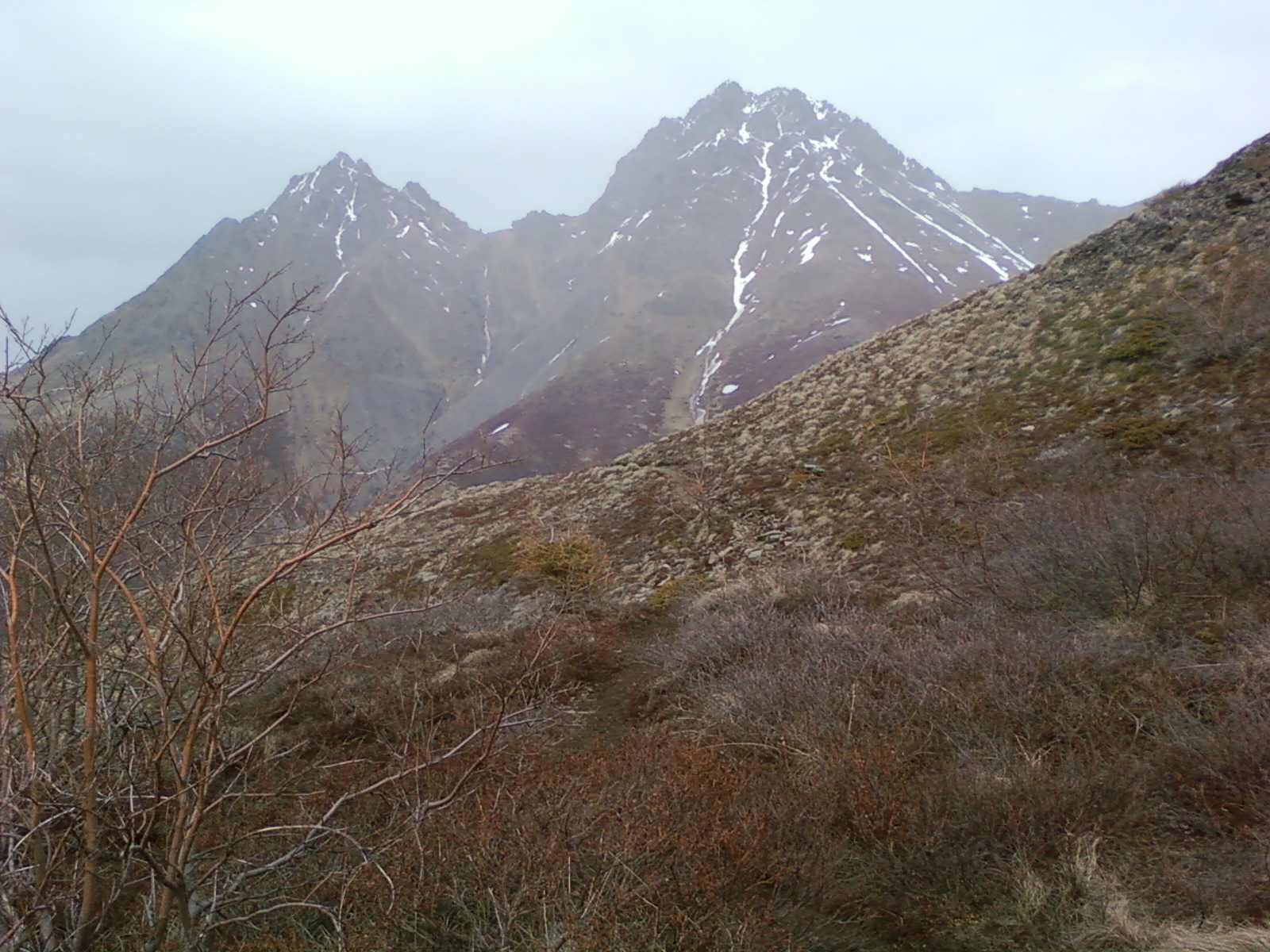My old friend Gilles F. and I decide to blow off the conference and go for a hike. We end up hiking in the hills above Eklutna Lake, about 30 miles NE of town. It's raining/misting slightly, and as we get higher it cools off and the rain turns to light snow. The trail get a little sketchy.