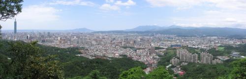 The trail continues along a ridge, passes a small Buddhist temple and an exercise area, and reaches a junction. We continue a bit past it, and are treated to a close-up panoramic view of downtown Taipei; the 101 skyscraper is not far away.