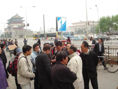 We try to synchronize with Francois via SMS to meet at a Peking duck restaurant, but his directions are bad and we end up hanging out with some street vendors; Nicolas buys a Chairman Mao watch with a hand that waves up and down every second.