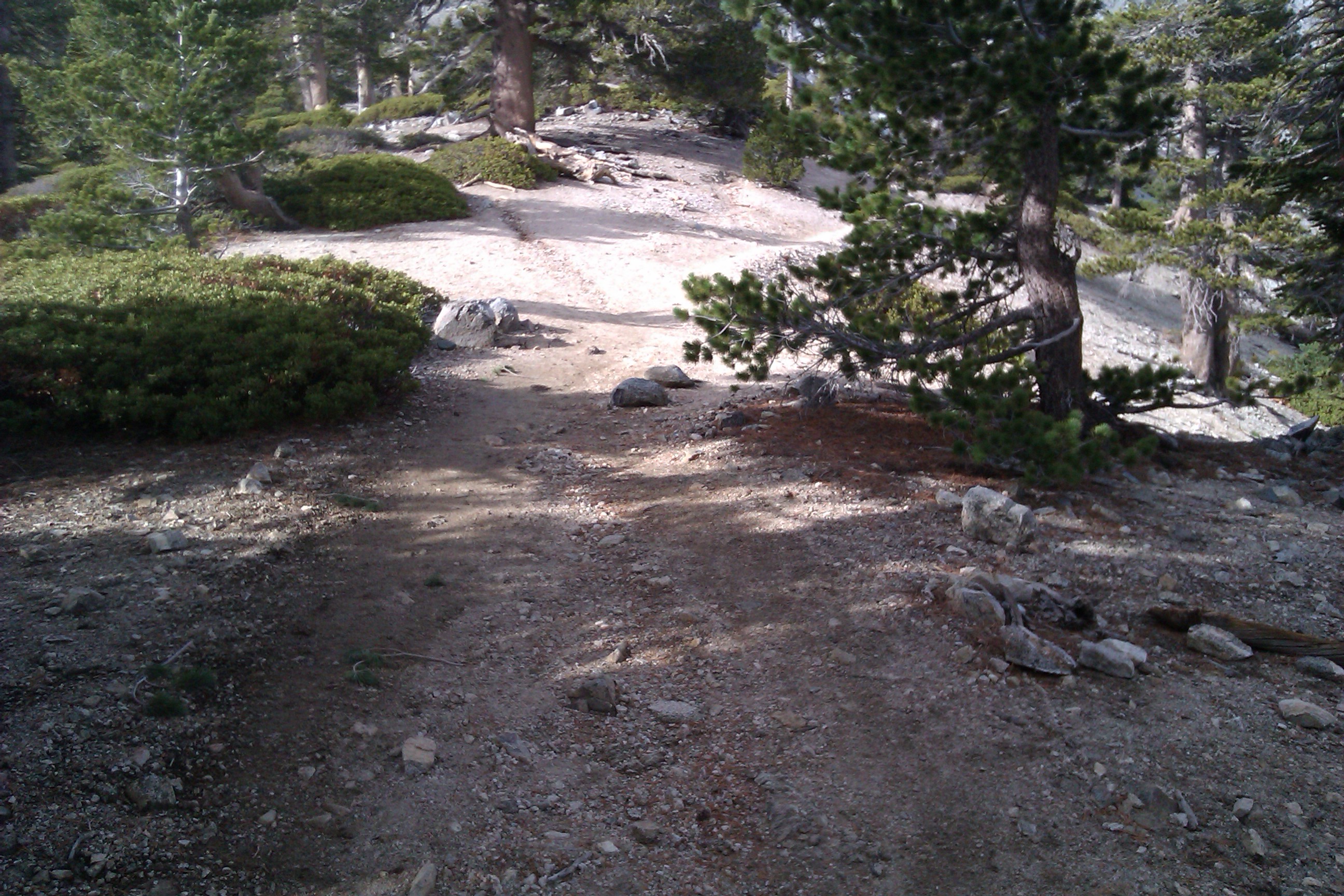 I descend the steep, winding trail in the trees next to the bowl. Cory and Diego come up behing me, moving fast. I latch onto them, and talk with Cory about motorcycles and scooters (he rides a Yamaha 600 sport bike, and is wearing motorcycle boots on this hike, and an aerodynamic motorcycle backpack).