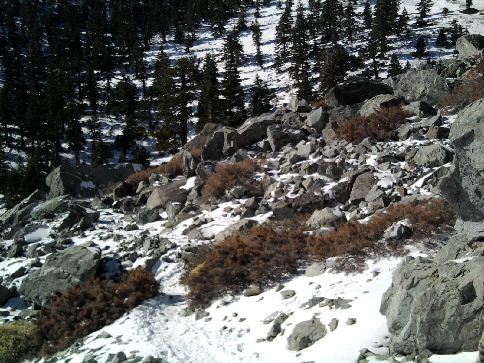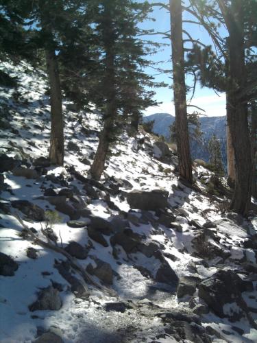 The trail goes up the right side of a steep-walled canyon. Sure enough, the trail is very icy. Previous hikers packed down the snow on it, which then melted, formed puddles, and refroze. In places it's glare ice. I don't have crampons. To walk, you need to look for sources of friction: protruding rocks, patches of packed snow, dirt.