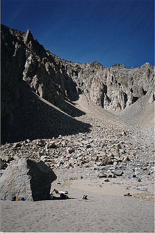 We go the lake and fill water containers. I add 3 gallons of water to my load - 36 lbs, which feels like a lot. We start up the left headwall. The rocks are mostly stable. Mike leads, setting up cairns frequently to mark our descent. We reach a steep section with loose rocks; Mike spaces us to minimize rockfall danger.