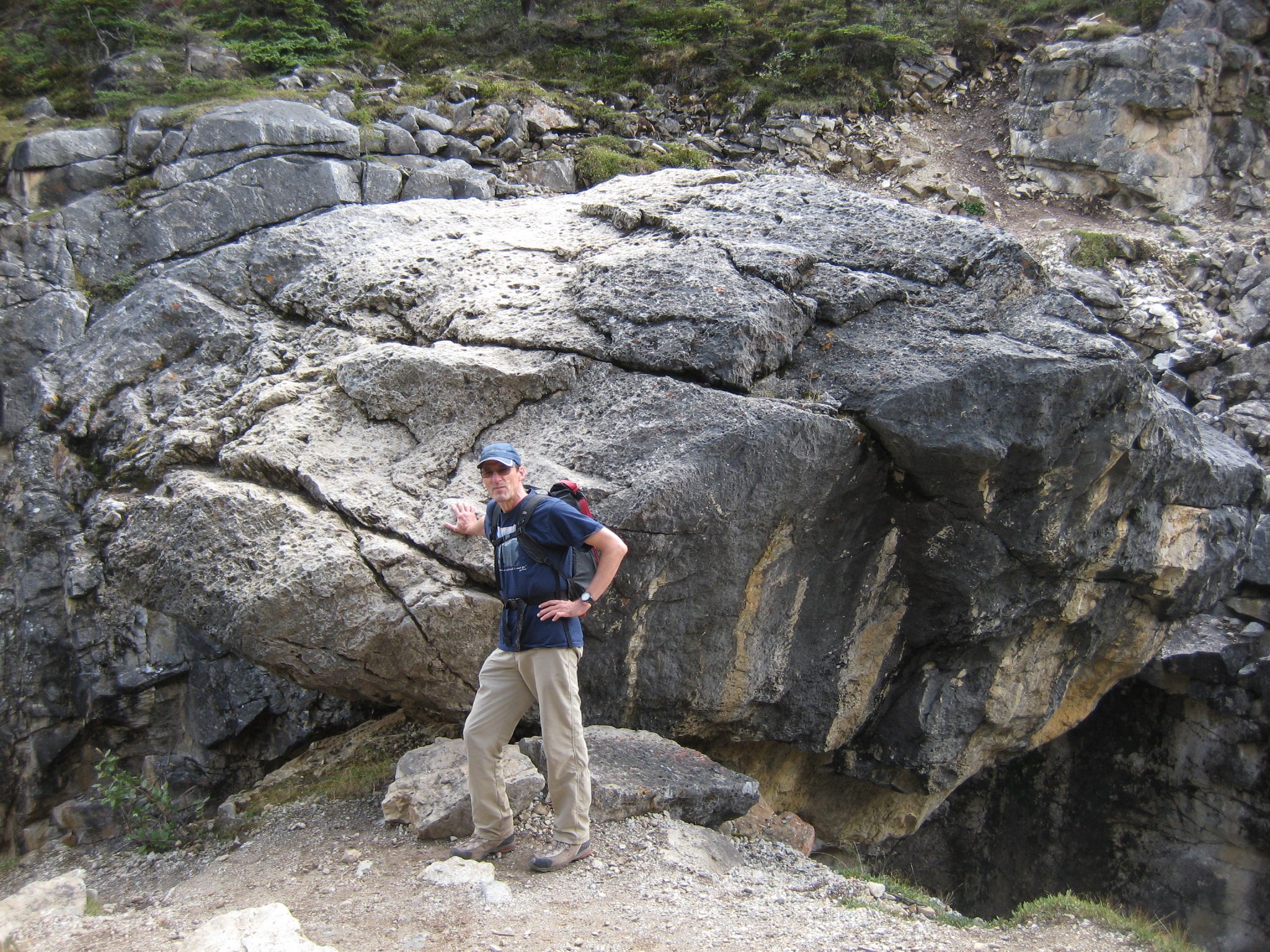 We descend. In the parking lot there are two vans full of geology students from the University of Victoria. Their professor wears a bizarre plaid tie. I ask a pleasant young man a series of questions about the geology of the Rockies, and we briefly discuss granitic plutons.