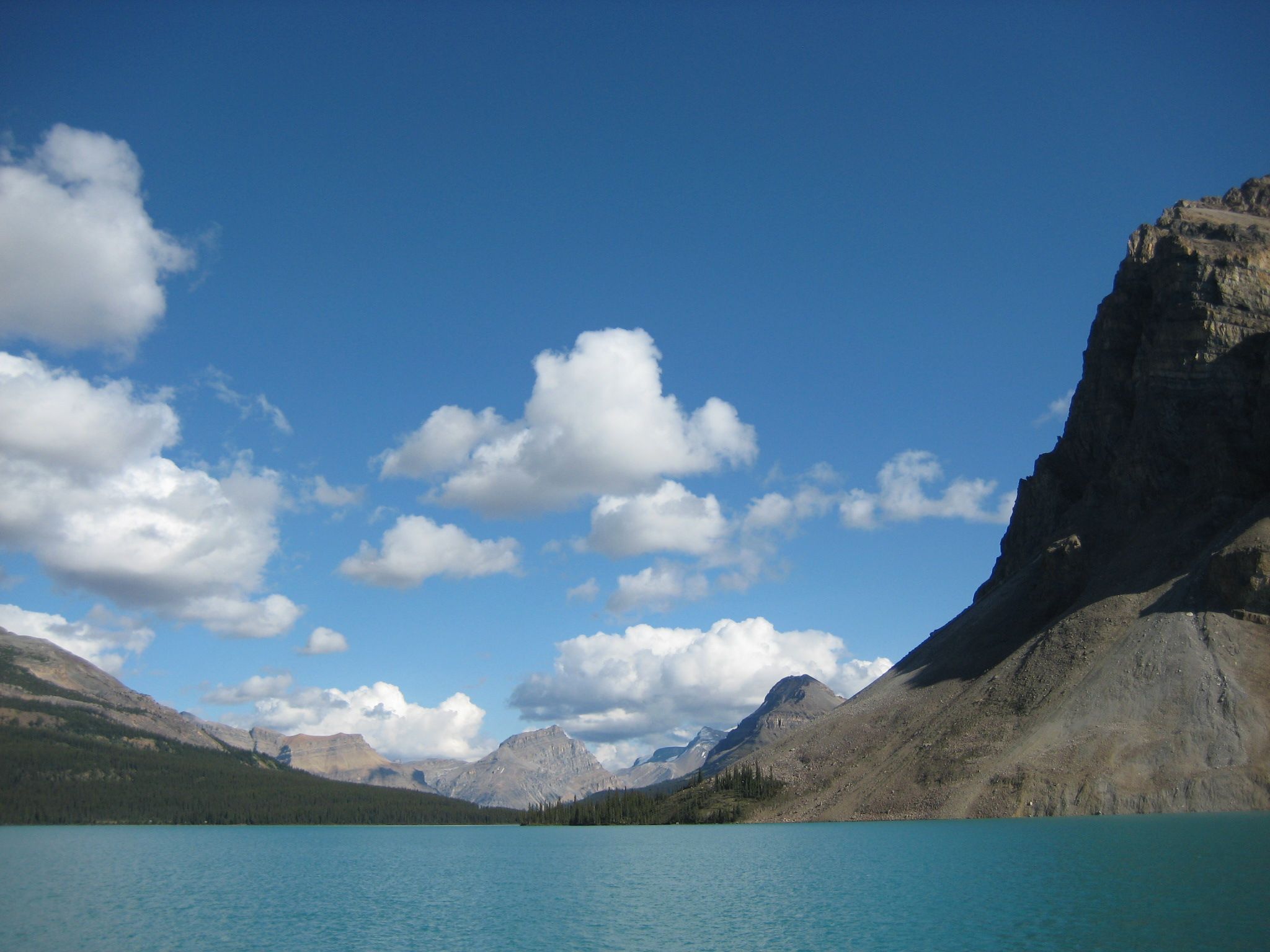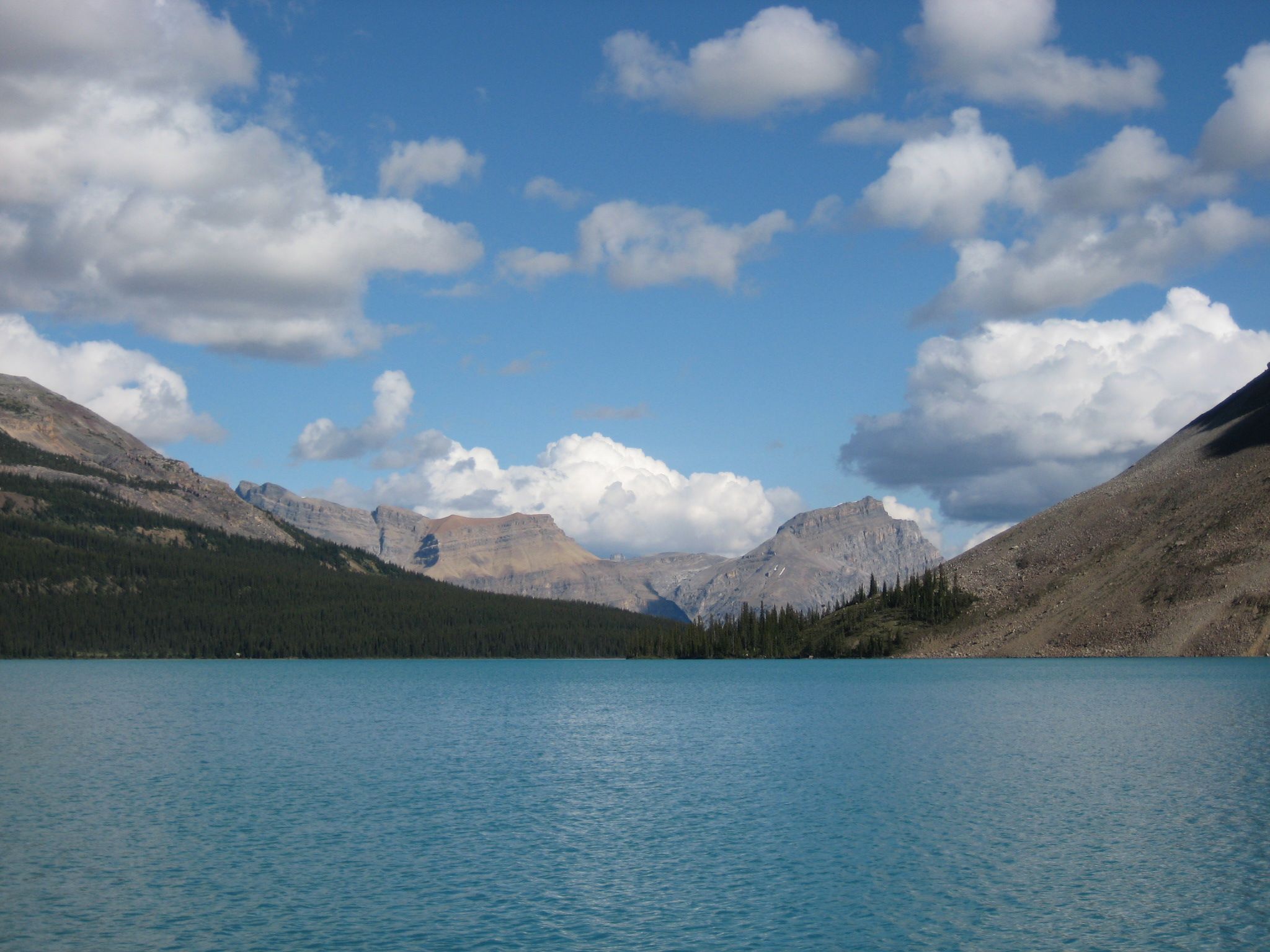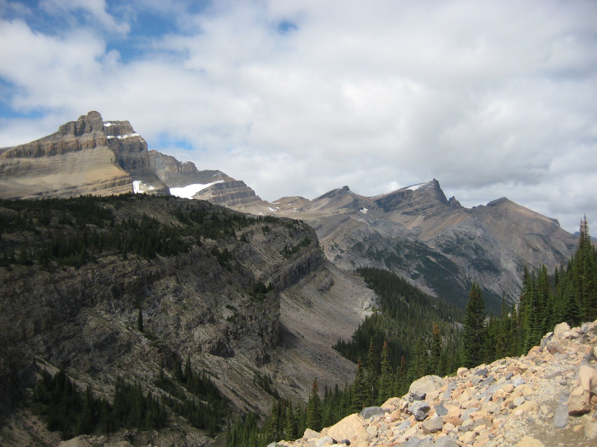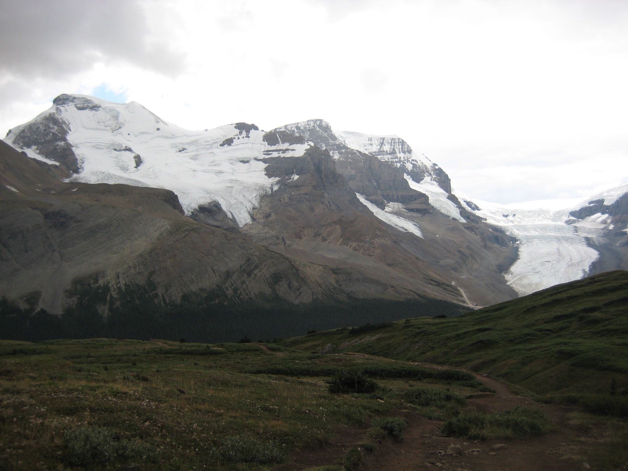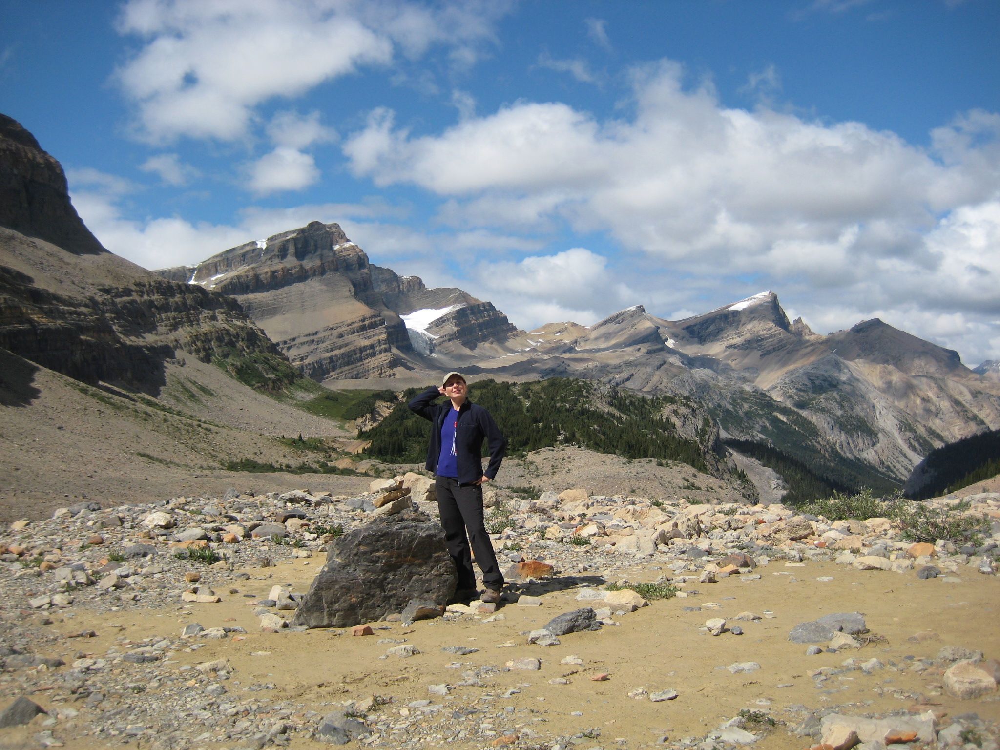 We take a left turn and climb to the Wilcox Lookout (or at least a nearby hill). A group of 10 or so mountain sheep sit serenely on a nearby slope. We stop and have lunch: brown bread, cheddar, trail mix, and the ever-present corn chips. In front of us is a spectacular view of Mt. Andromeda, Mt. Kitchener, Snow Dome, and various and sundry glaciers descending from the giant snow field behind the line of peaks.