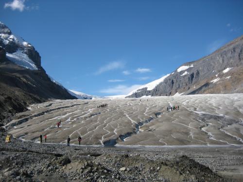 We park at the Athabasca glacier. Arvid's group is still gearing up, so he's OK. Y and I hop the barrier, walk across some rocks to the glacier, and clamber around a little. A couple with crampons and rope is starting up, saying they'll climb to the top of the glacier in 3 hours. Walking tour groups use a fancy plank bridge to cross a stream that one can easily step across.