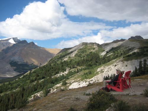 We drive 1 Km back down the road to the Wilcox Pass trailhead. It's sunny and warm. We head up the trail. Y sets a fast pace. We pass a pair of bright red Adirondack chairs and sit briefly.