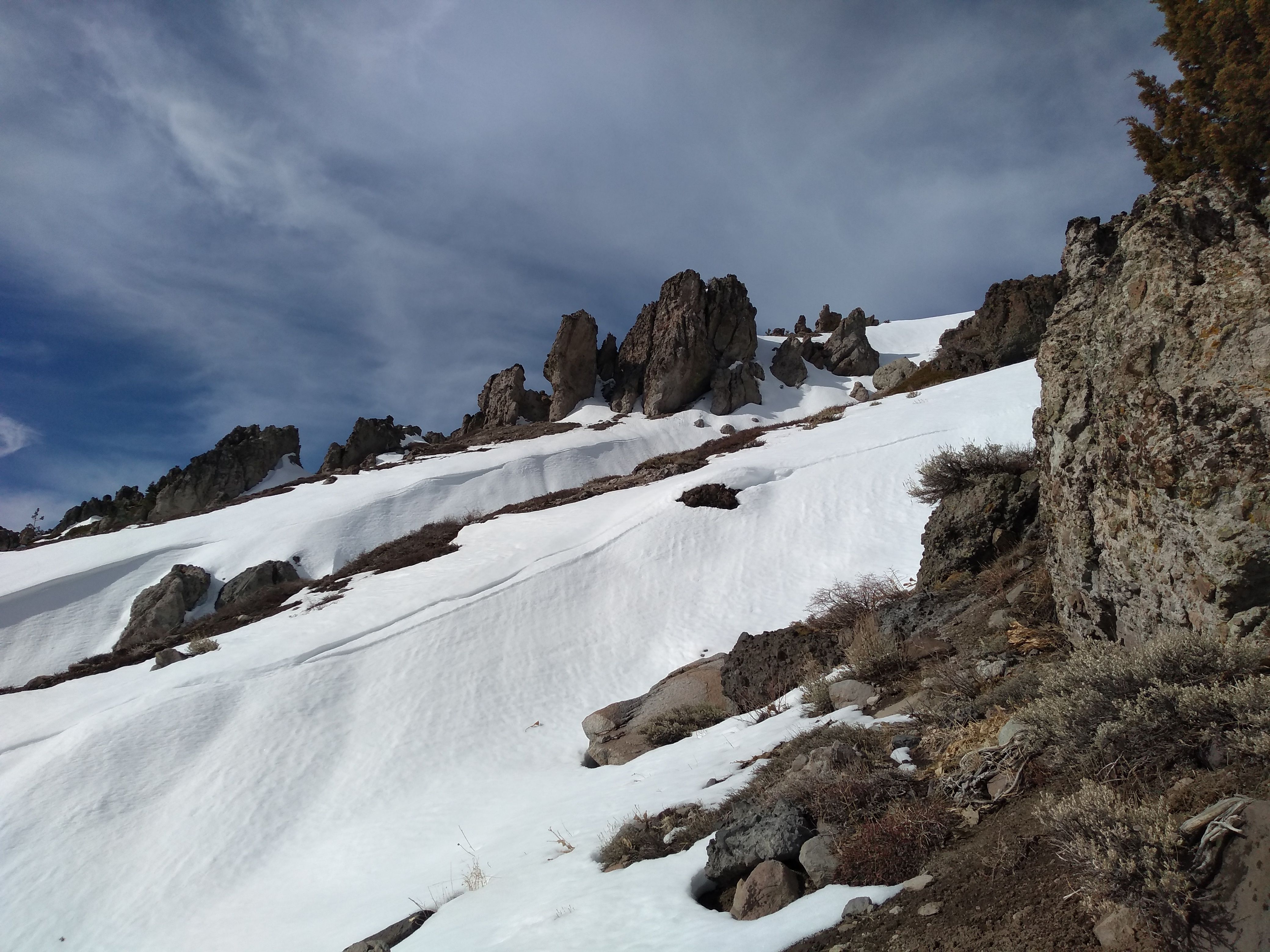 The snow on the rocky slope is patchy and it would be a bit of work to find an all-snow route to the top.