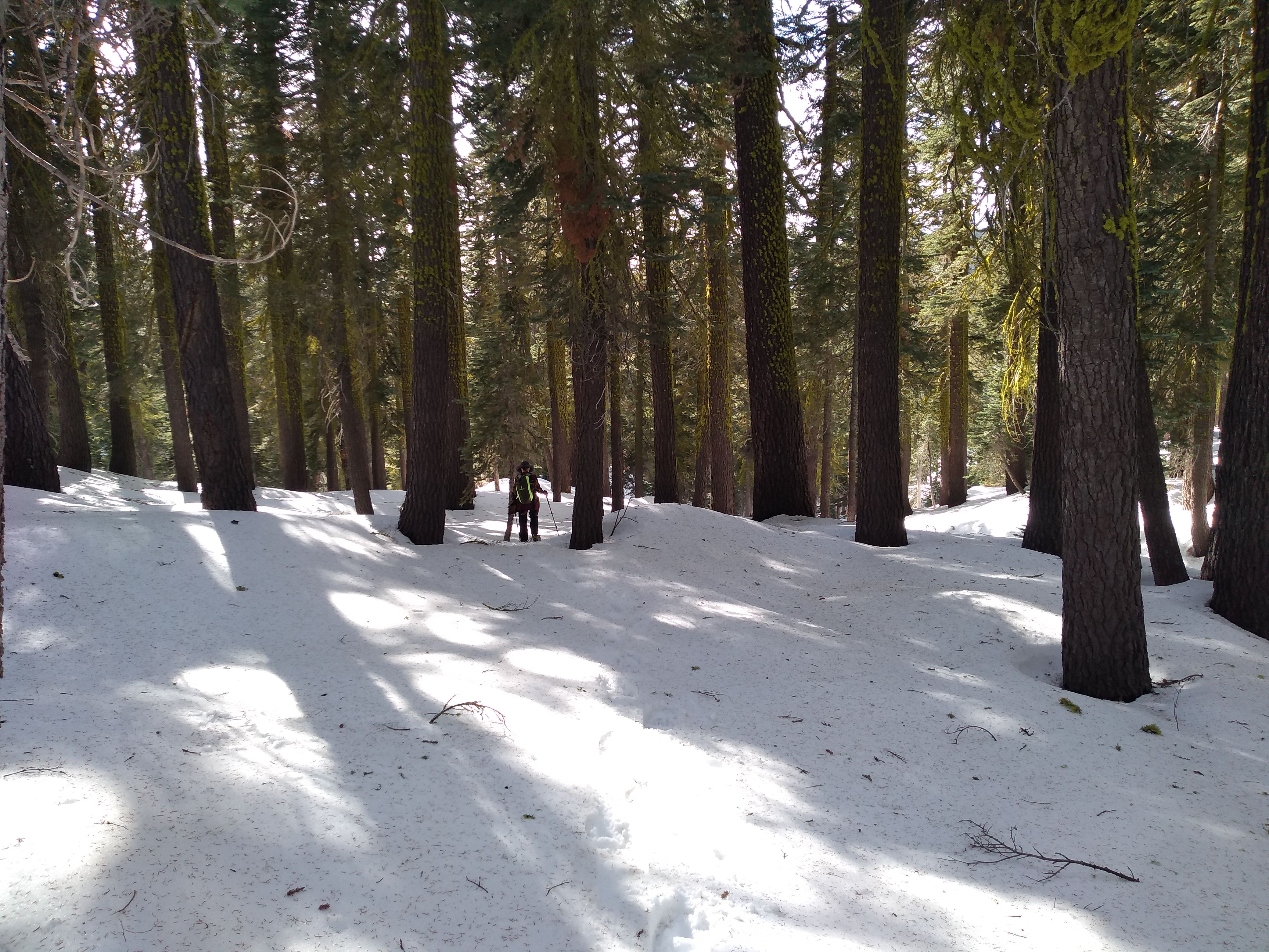 We go up the road to where it opens out into a meadow (covered with snow this time of year). It's very pleasant (50-ish) and snow conditions are good. M is taken with the color of moss on the trees.
