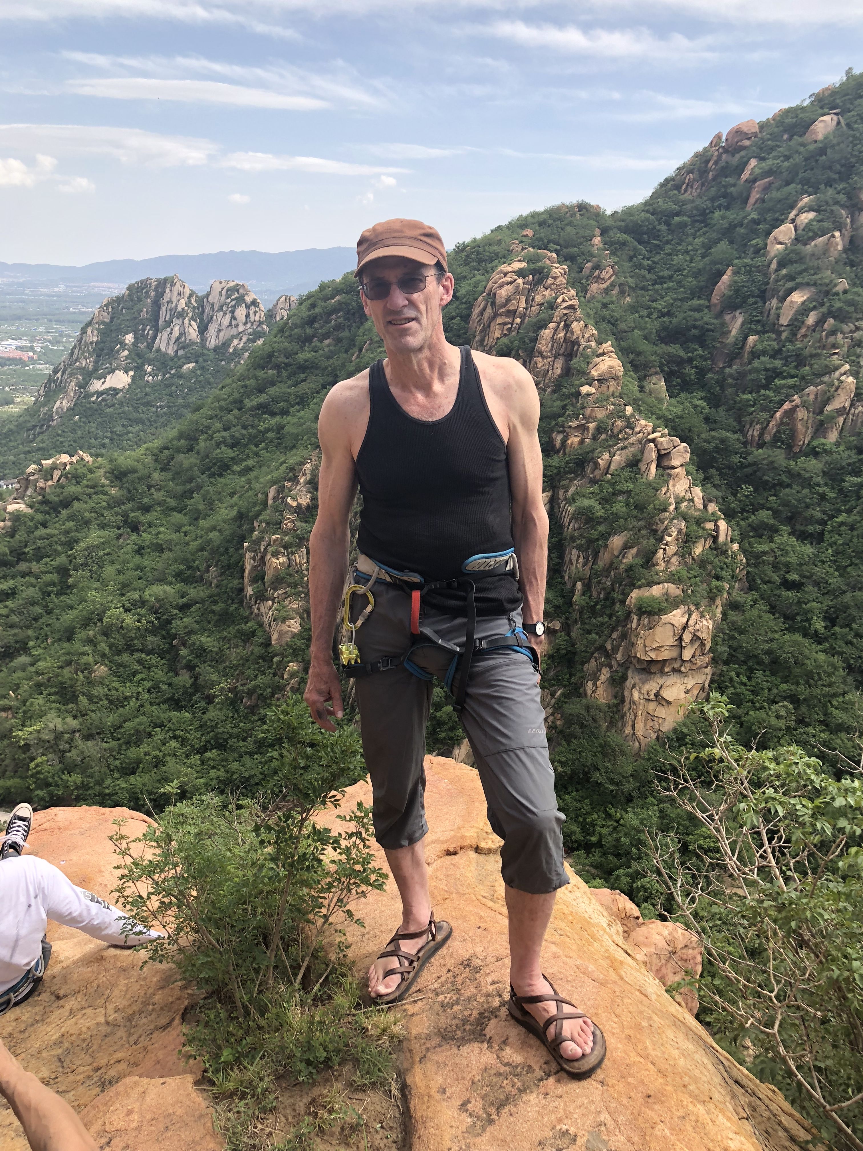 Climbing day. I meet Wei Wei at 9. We pick up the boys, then drive to a small bouldering gym - "All in" - and meet the climbing guide (Ja - no English name). After a yummy brunch at a nearby hole-in-the-wall restaurant, we head north toward the mountains, along the same road that I took to the Great Wall, long ago. We turn west and end up in beautiful mountain ravine with tall rock formations on each side: orange/red rock on one side, light gray granite on the other.