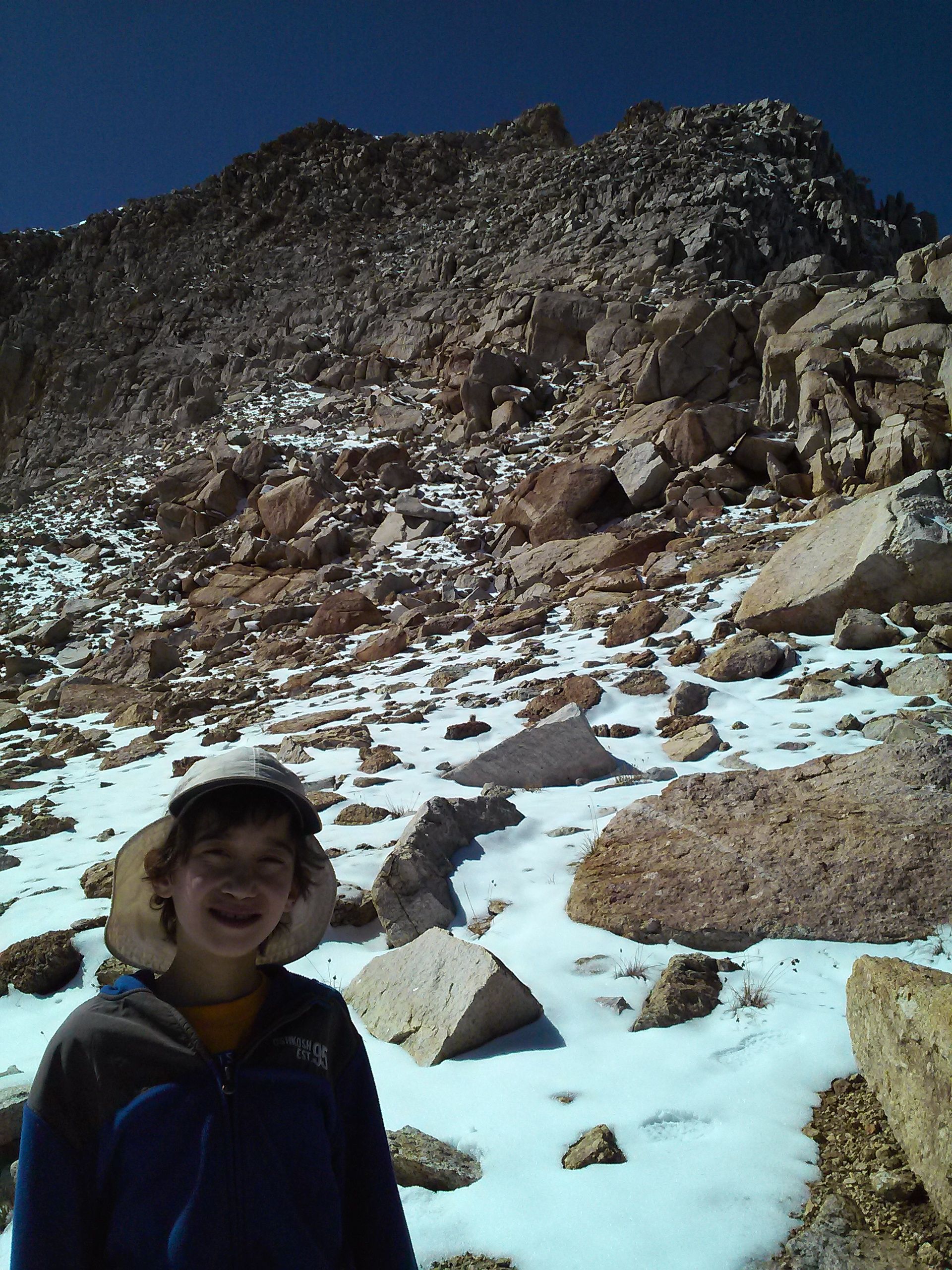 The first part of the cliff is hard for Noah; his hands and feet are very cold, and he's a little freaked out by the snow and steepness. I hand-hold him for a bit.