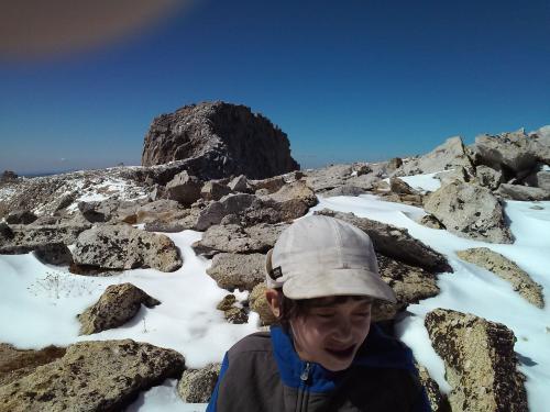 Rob graciously agrees to stay with Noah at this point while I make a dash to the summit. At several points on the way there are snow/rock patches even trickier than the arete. I summon up the concentration and energy needed to get past these safely. The summit is very windy; I take a video.