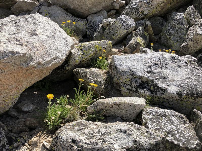 S: "This is Alpine Gold or Hulsea algida. A plant only seen by alpinists since it occupies an elevational range of 9,500 to 14,500 ft. Very striking to see such a large showy plant in a sea of rock and when most alpine plants take a "cushion" growth form meaning they are growing close to the ground."