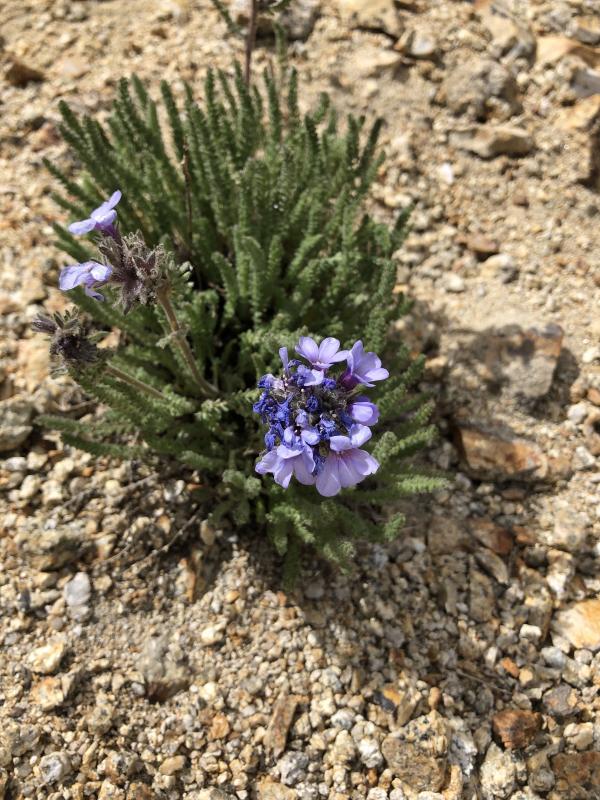 S: " Here is the other plant botanists get really excited about - it's called sky pilot or Polemonium eximium. It's in the phlox family. This individual in the photo is past its prime, but when at it's best is covered in large spheres of purple flowers. It occurs even higher beginning at 10,500 ft and extending to 14,000 ft."