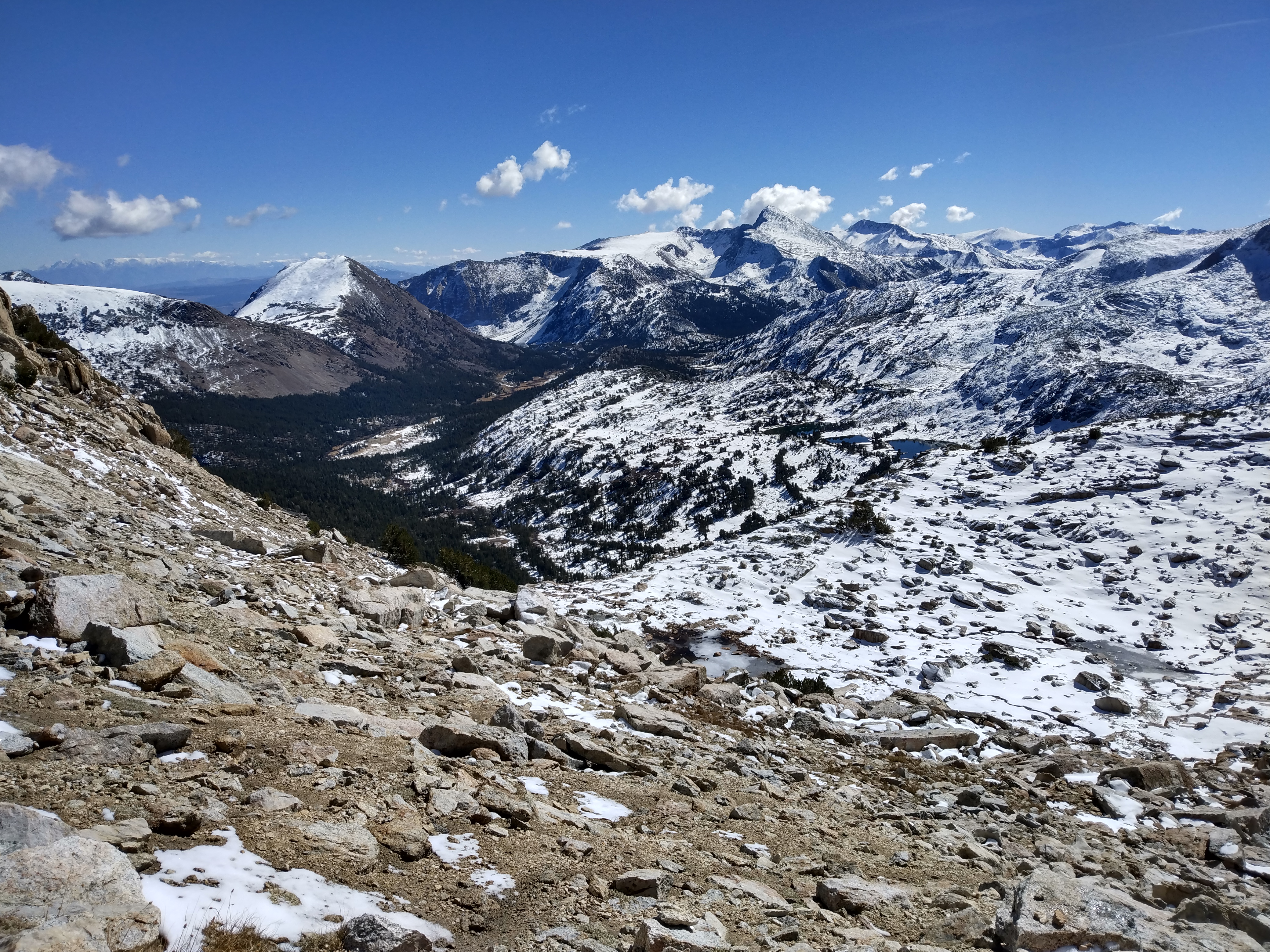 At the pass, we stop and do the hike towards Sonora Peak, which Noah and I did a few years ago. There's patchy snow.
