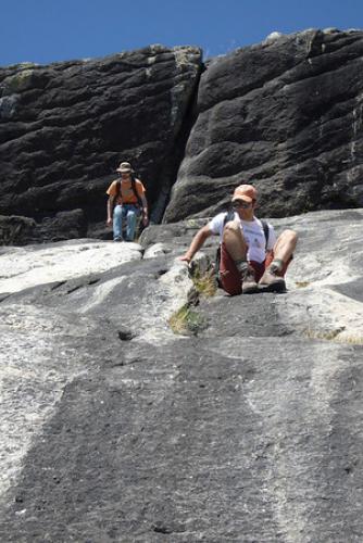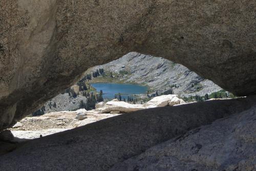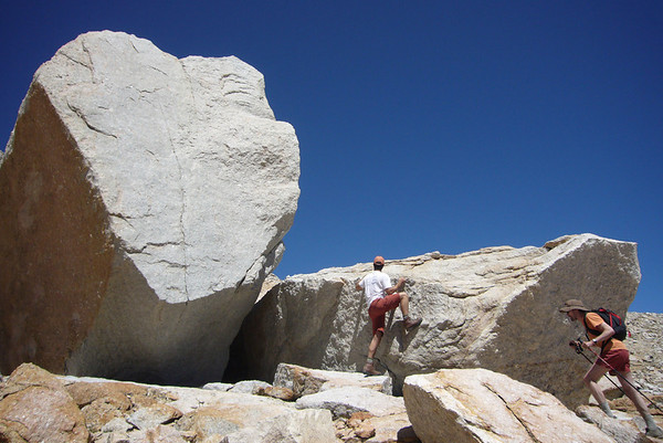 On the far side of the lake we scramble up a steep slab (a little scary), traverse under a black overhang, then slide down on our butts.