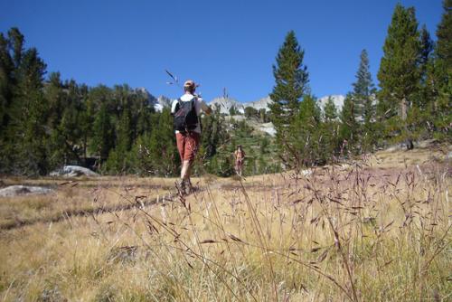 We stop at the Mobil station for breakfast sandwiches and coffee, then drive to the May Lake trailhead. We're all a bit weary from Conness, We go about 1May Lake and hang out. We walk around the lake counter-clockwise, pausing to strip down, wade out to a rock, and go for a dip.