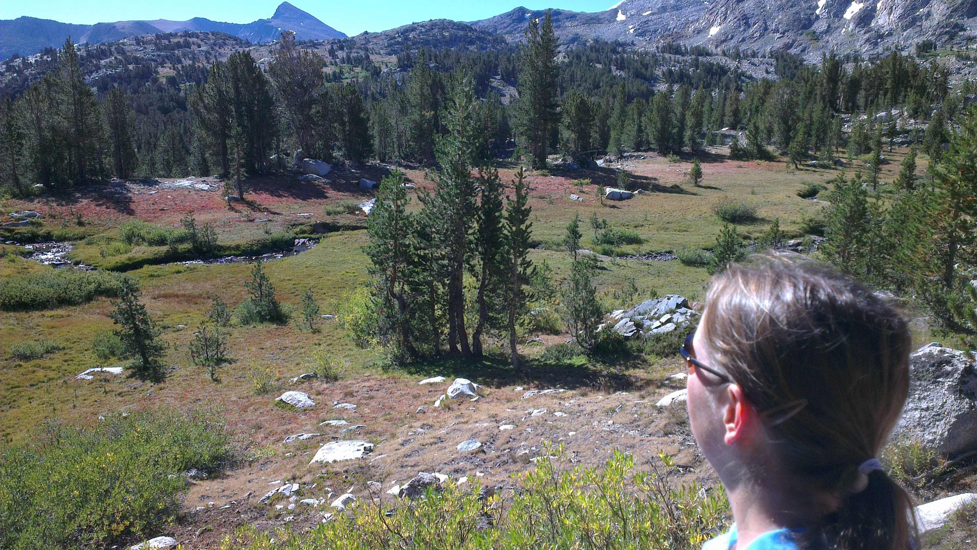 We rest for a while at the bottom, enjoying the extreme beauty of the meadow, and marveling at the height and immensity of what we just climbed.