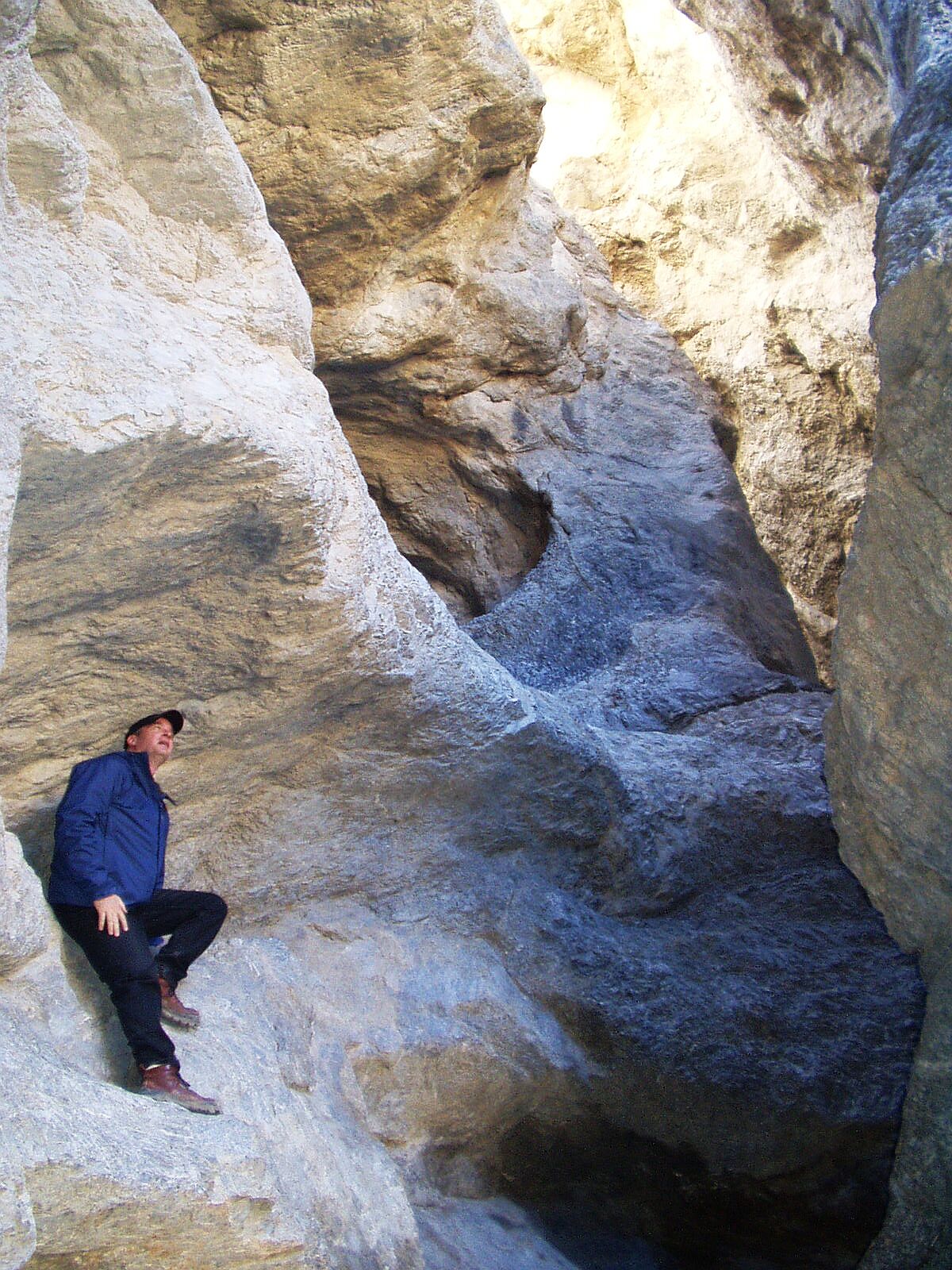 We hike up Mosaic Canyon - HIGHLY RECOMMENDED; DO NOT MISS. Beautiful swirly marble formations and Breccia that's like a display case of interesting rocks. Rich and I wax rhapsodic about the beauty of nature, compared to which all human art is pallid dreck.