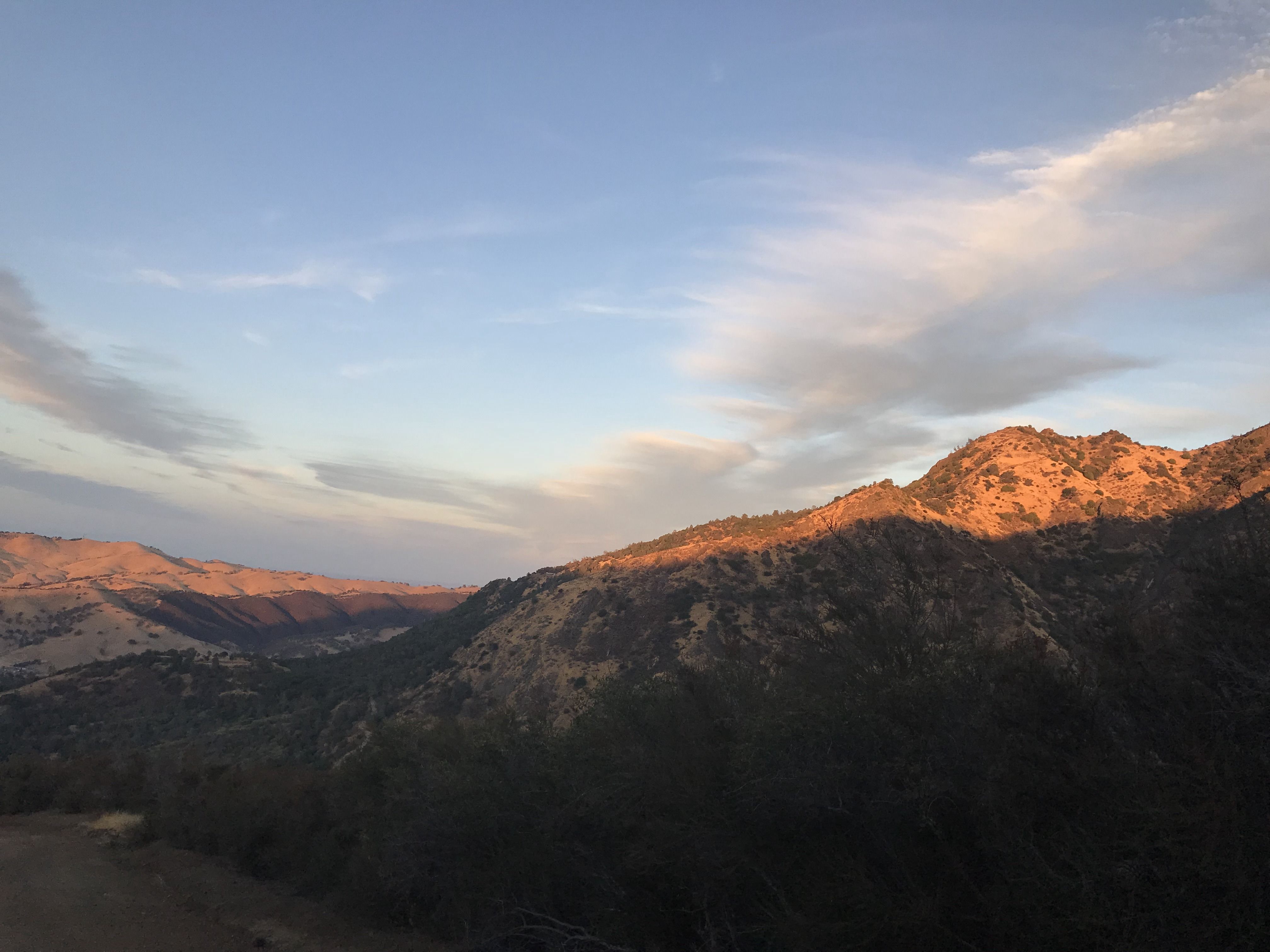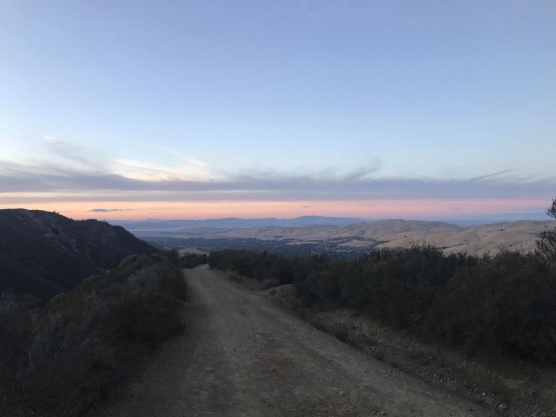 We reach Murchio Gap around 6, and the sun is going down. After some discussion, we decide to go down the fire trail (Meridian Ridge Road) instead of the Back Creek Trail. This is OK, but the loose dirt on the road causes a lot of slippage, and the road meanders around, adding some distance. The steep downhill causes some temporary pain in my right knee. The last mile is level and straight, and it's quite beautiful as the light fades away to night.