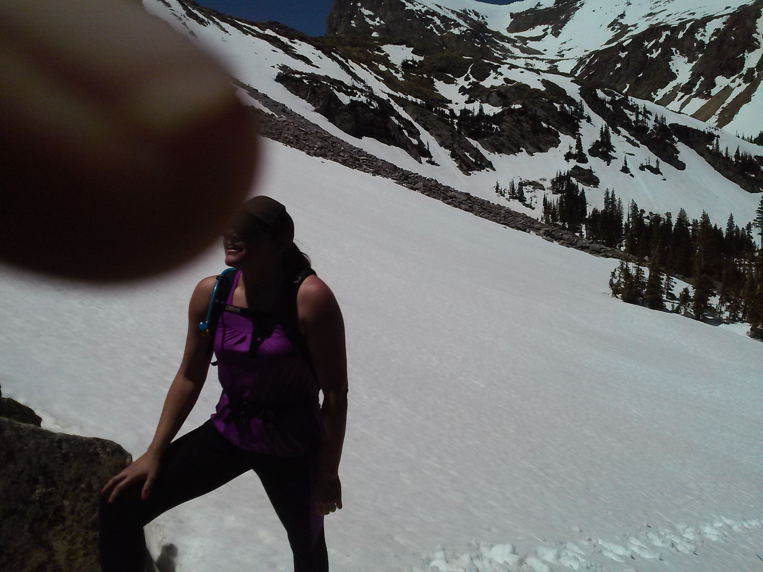 The ridge ends, and we have to get back down to the lake. A long slope of snow-filled forest is in our way. We look around for a trail bit find none. T tweaks her knee.
