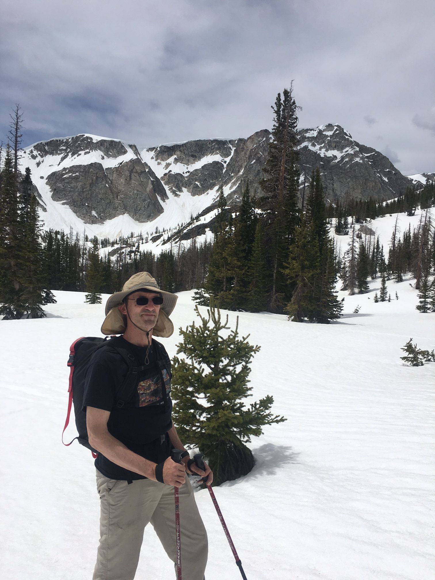 We make it above the treeline but not to the summit. Rain is predicted for the PM, and at noon there's a gust of cold wind as clouds move overhead. The hike down is bit unpleasant because of the slippery and irregular snow.