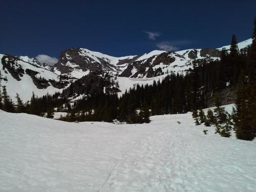 The head of the canyon is a steep wall below a lake. with a waterfall poking through the snow. The path up to the lake looks steep and slippery.