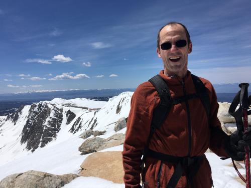 We come out on the top of a broad ridge, with a line of sticks indicating the continental divide. There's an incredible view of mountains in all directions. Ron and I rest while T explores.