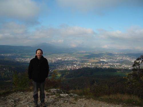 The chimney emerges in a thicket at the top of the cliff, beyond which is a restaurant/cafe (Europeans like to put these on top of things), next to which is a 100' observation tower that we scale via a spiral staircase, a la Vertigo. Great view from the top.