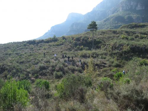 A short walk and scramble brings us to the base of the cliffs. There are some sport routes. We come to a gully and head up. The gully becomes steeper and narrower; the last 10' are a vertical chimney. But the rock is marvelously featured, and it's not too hard or dangerous (though I have to encourage Nicolas a bit).