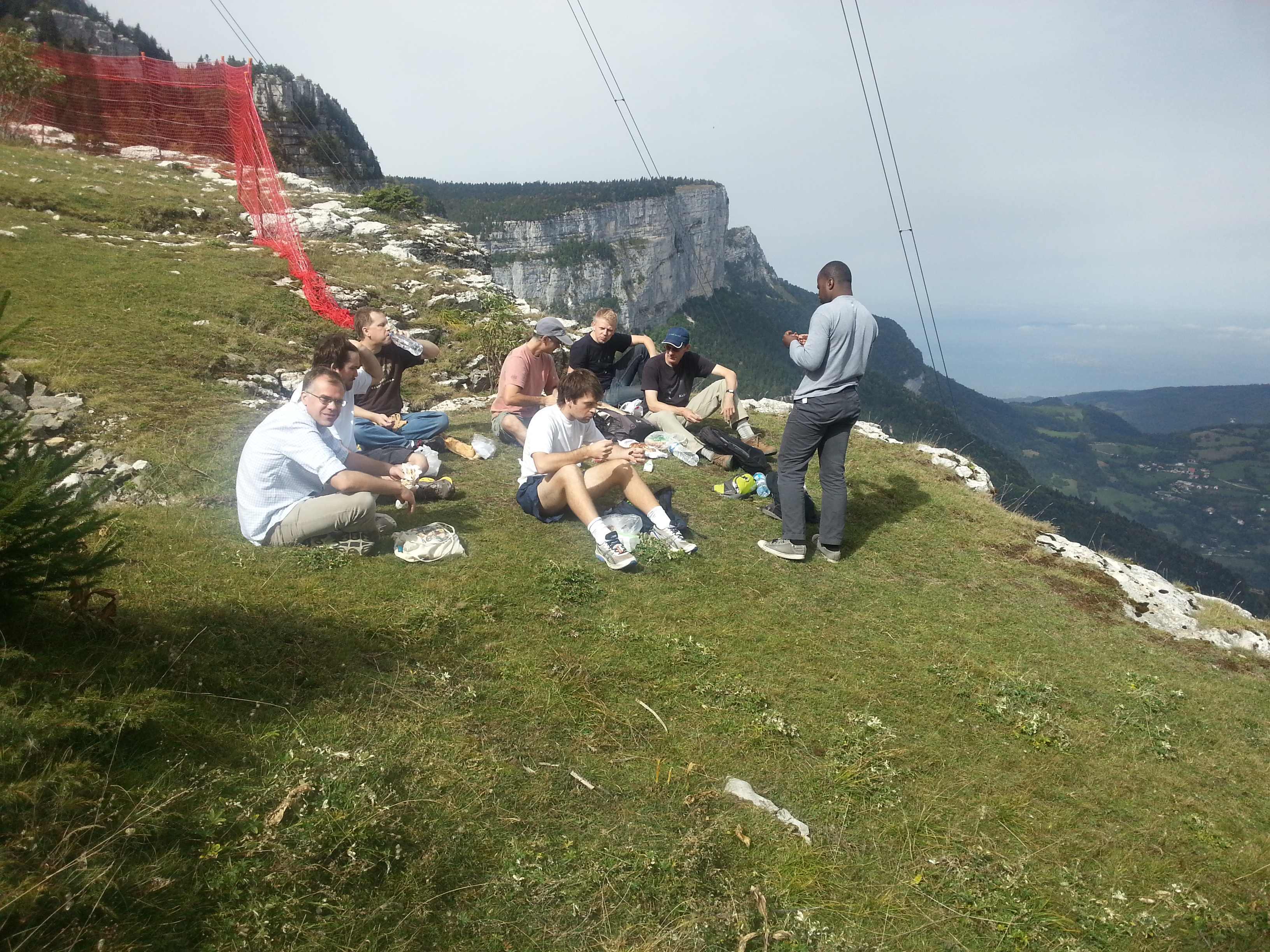 Afterward, a smaller group goes out to dinner. After a fair amount of random wandering. we end up in a great place on a small plaza near the Isere. Children play soccer. We go to a bar next door where all drinks are 2E, popular with students and dates. Chartreuse all around.