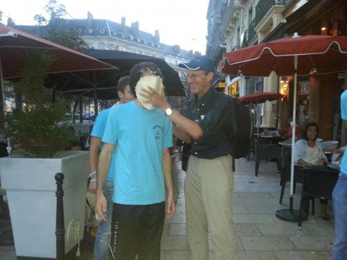Afterward, a large group eats at La Palais at Place Victor Hugo. A group of students comes by; if you give them some money you can give one of them a shaving-cream pie in the face.