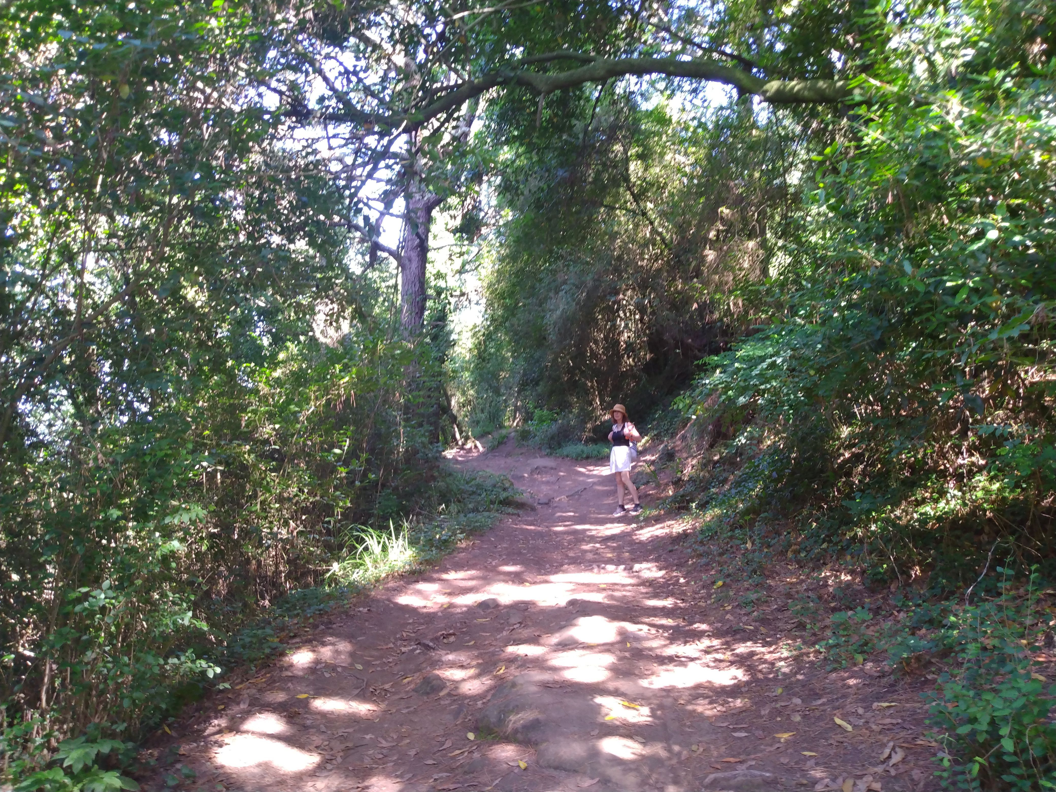 Google Maps shows an area of forested hills NE of town, with trails, so we head there. An extremely nice trail goes along the top of cliffs overlooking the ocean. We pass a peninsula with ruins; next time go there.