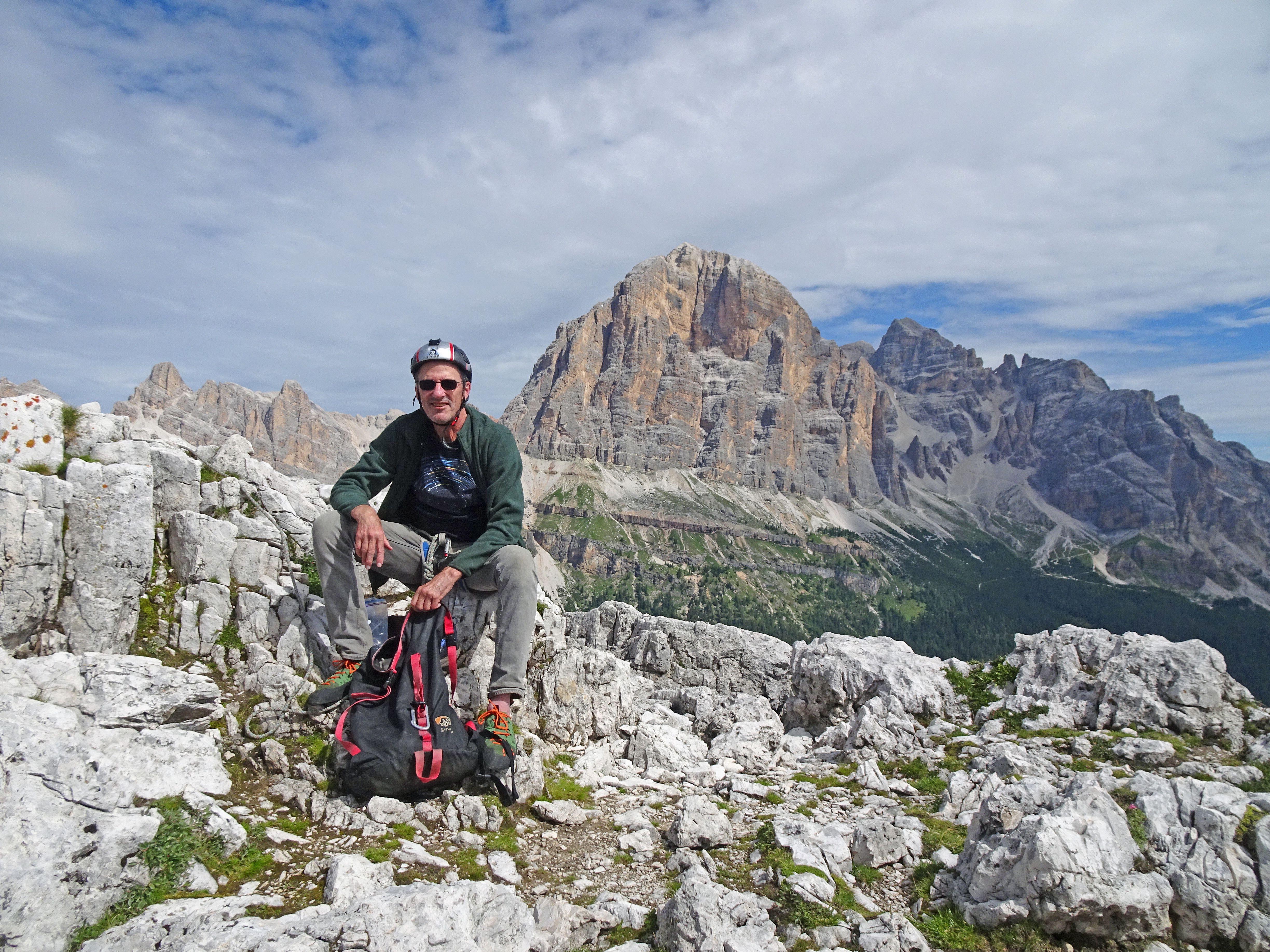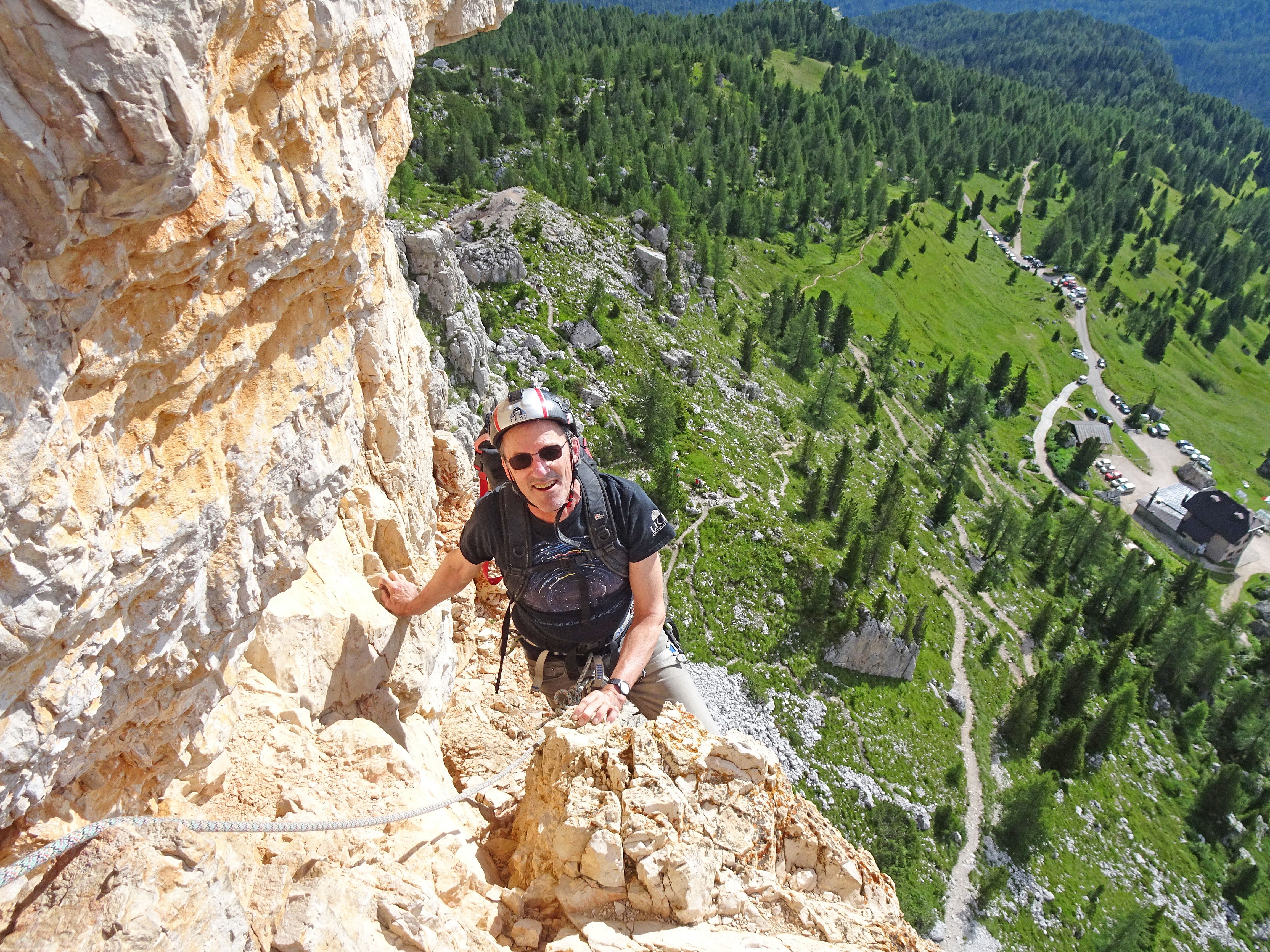 I meet Enrico, who's about my age. We drive to Cinque Torri (5 towers). The view is stunning. We start with Via Miriam, a 530' 5-pitch climb with a couple of cruxes and an exposed traverse, but mostly straightforward (though since I haven't climbed outdoors in years, it seems pretty hard to me, especially aerobically). I fall at the 2nd crux but get through it. I use my helmet a number of times.