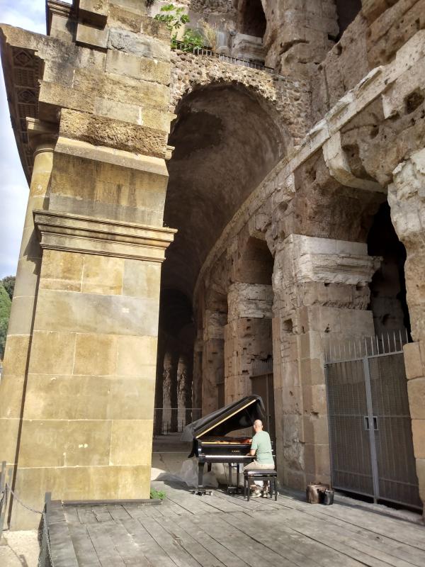 We ride past Teatro di Marcello, a Coliseum-like structure completed in 12 BC with a newer layer of apartments on top (which sold for ~E20M each). Bita points out that development in Rome is lasagna-like: new structures built on top of older ones. Outside, a guy is tuning a Kawai grand piano.
