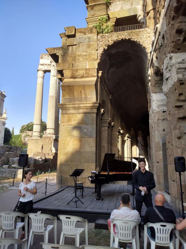 I get to the Teatro (which is at the base of Campidoglio) in the nick of time, but it turns out the concert isn't until 7:15. I go to a nearby cafe and get a birra piccola and an egg/tomato sandwich. At 7 I go to the venue. There are c. 100 plastic chairs. I have a 'back rows' ticket, but the usher dudes tell me to sit wherever I want.