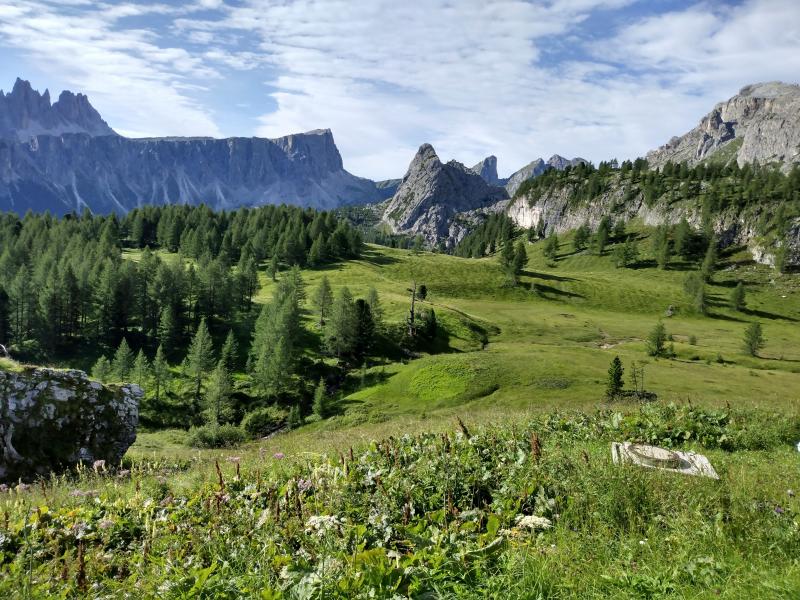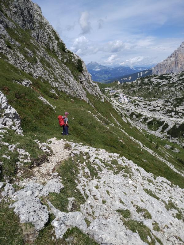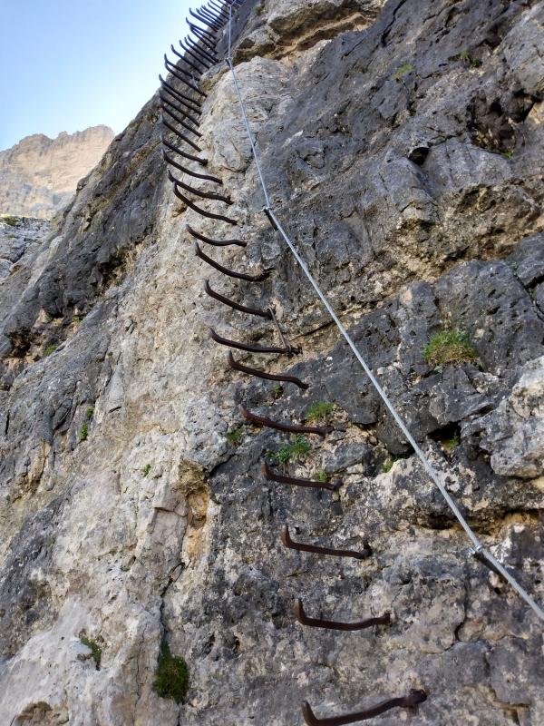 We drive about 30 min to the base of Tofana di Rozes, a large massif. We do a hike that circumnavigates this, climbing up to the left shoulder, way down to the valley in back, up a 300' Via Ferrata, then up a long steep rocky slope to a refuge on the right shoulder.
