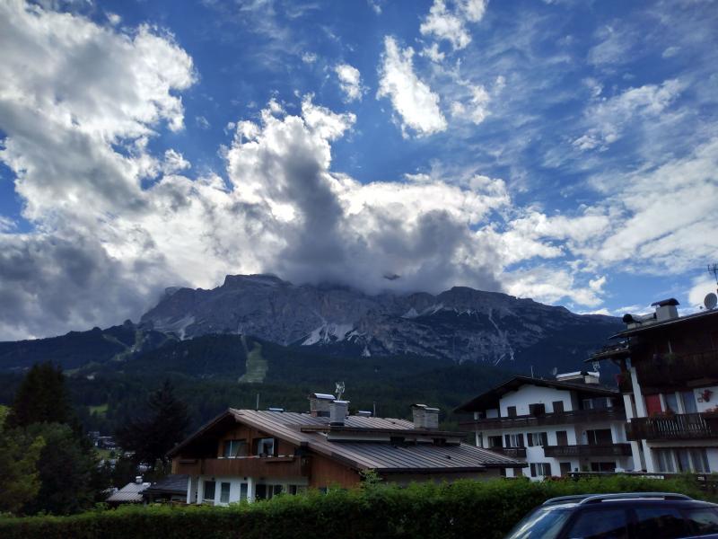 The drive to Cortina ends up taking c. 3 hours due to traffic jams. The first ~50 km are on a 4-lane highway with trucks, then 2-lane roads. It starts to rain, but the sun is out and there's a fabulous rainbow that lasts for about a half hour.
