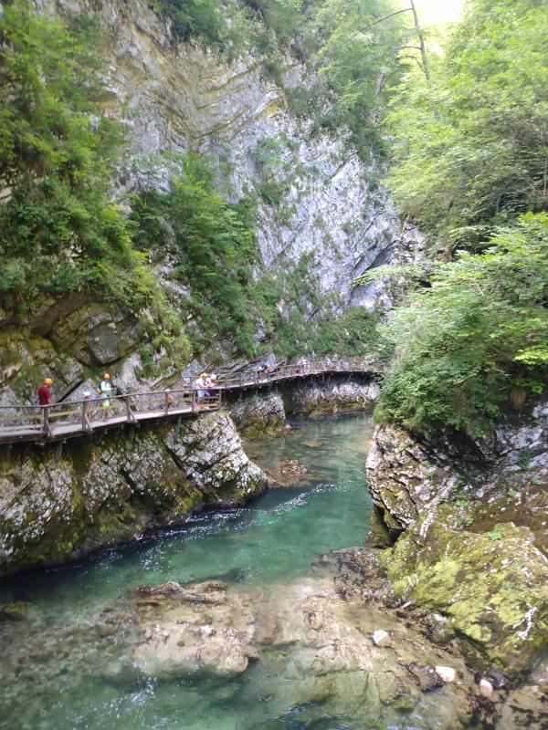 We walk to the bus station and catch the 2:50 PM shuttle to Vintgar gorge. We have time to kill waiting for the guide. Ann gets hot dogs, w/ bacon and cheese; you get 2 whether you want them or not: bad. I get a veggie thing: bad.