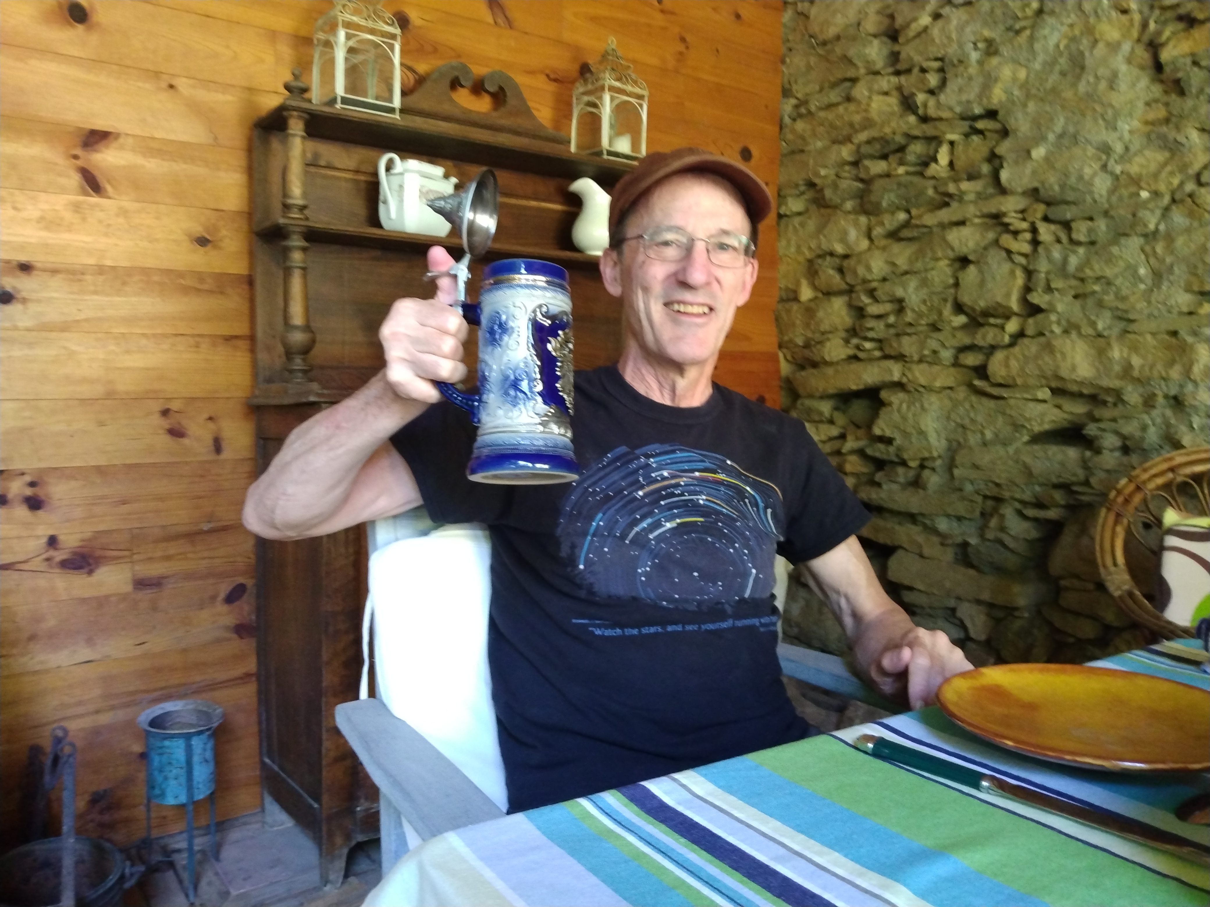 They give me presents: a 'Super Mann' cookie, chocolates, and a fancy ceramic beer stein. What great hosts!