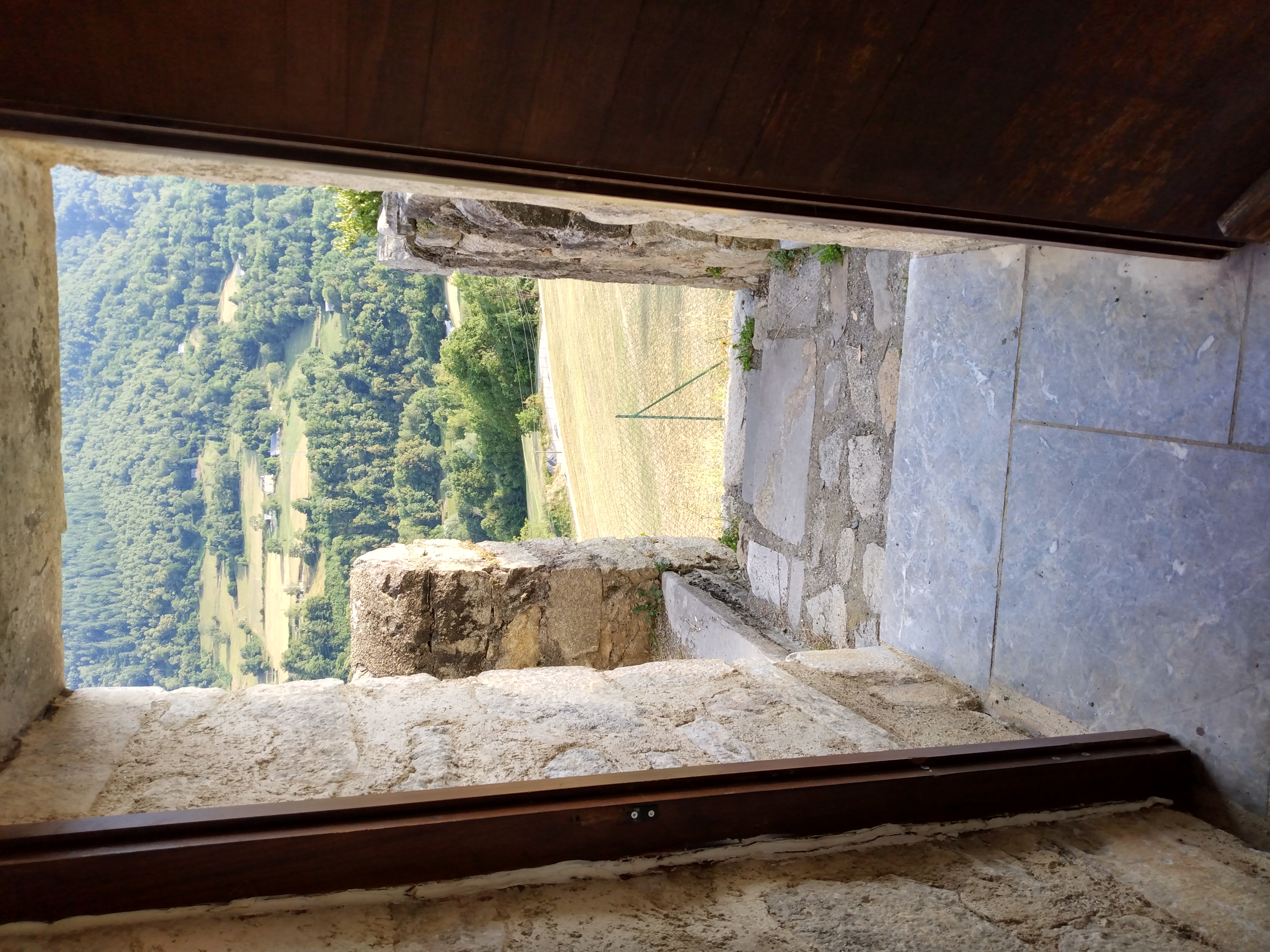 Adjance to town is a huge rock pillar with a fort on top. We stroll over there. The pillar has a 15' wide crack; the walkway goes into this. Inside there are rock climbers doing the sport routes on an interior face of the crack.