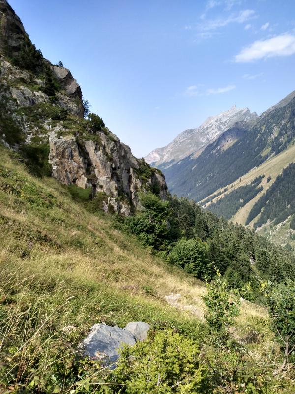 We drive toward Pont d'Espagne, hoping to hike. But the parking lot is full and the road is blocked. So we drive back down, then up another road that leads to a ski-area parking lot that's not full. A trail leads up the valley to a lake whose name (in Occitane) means 'Where's the lake?'.