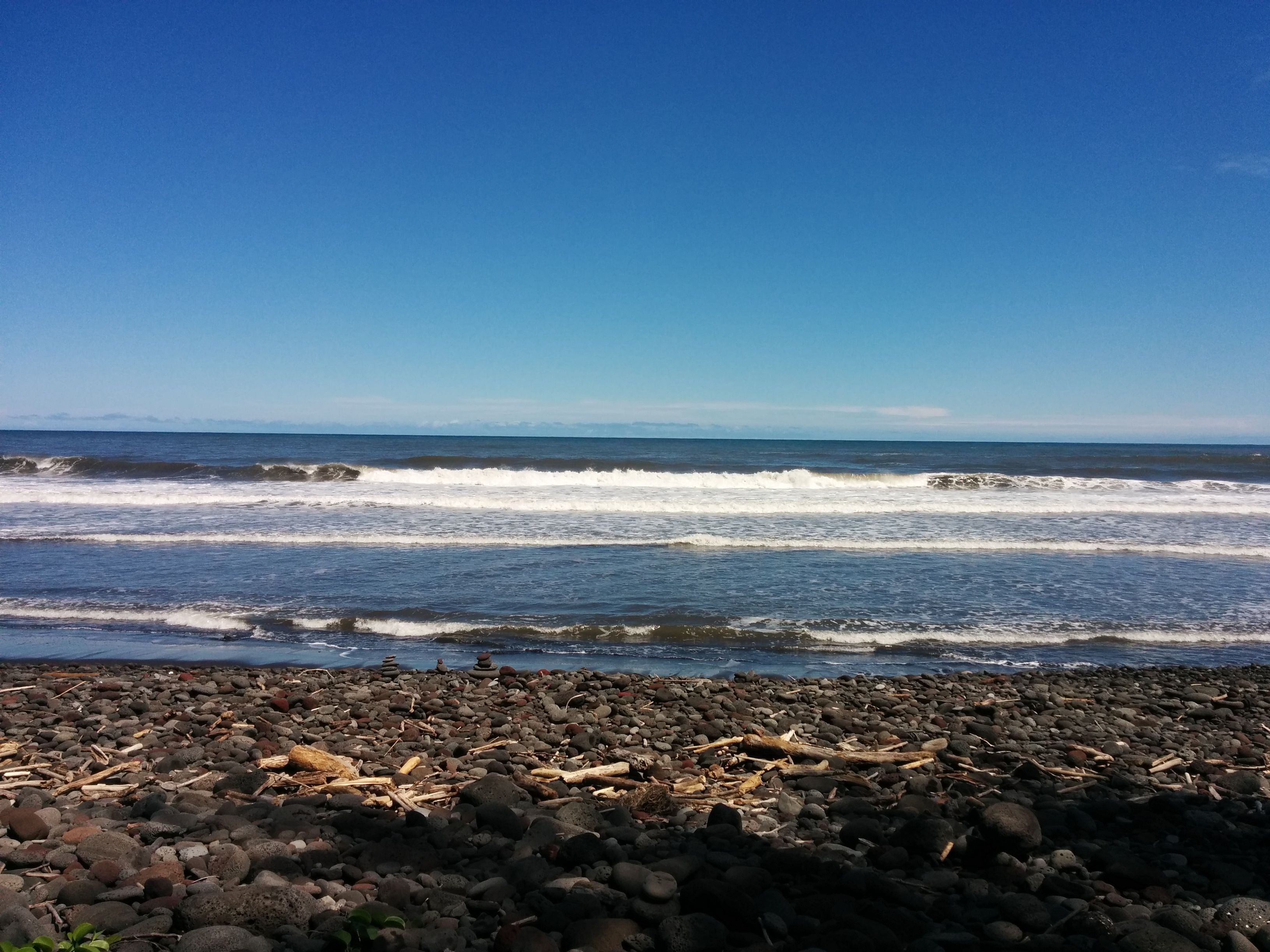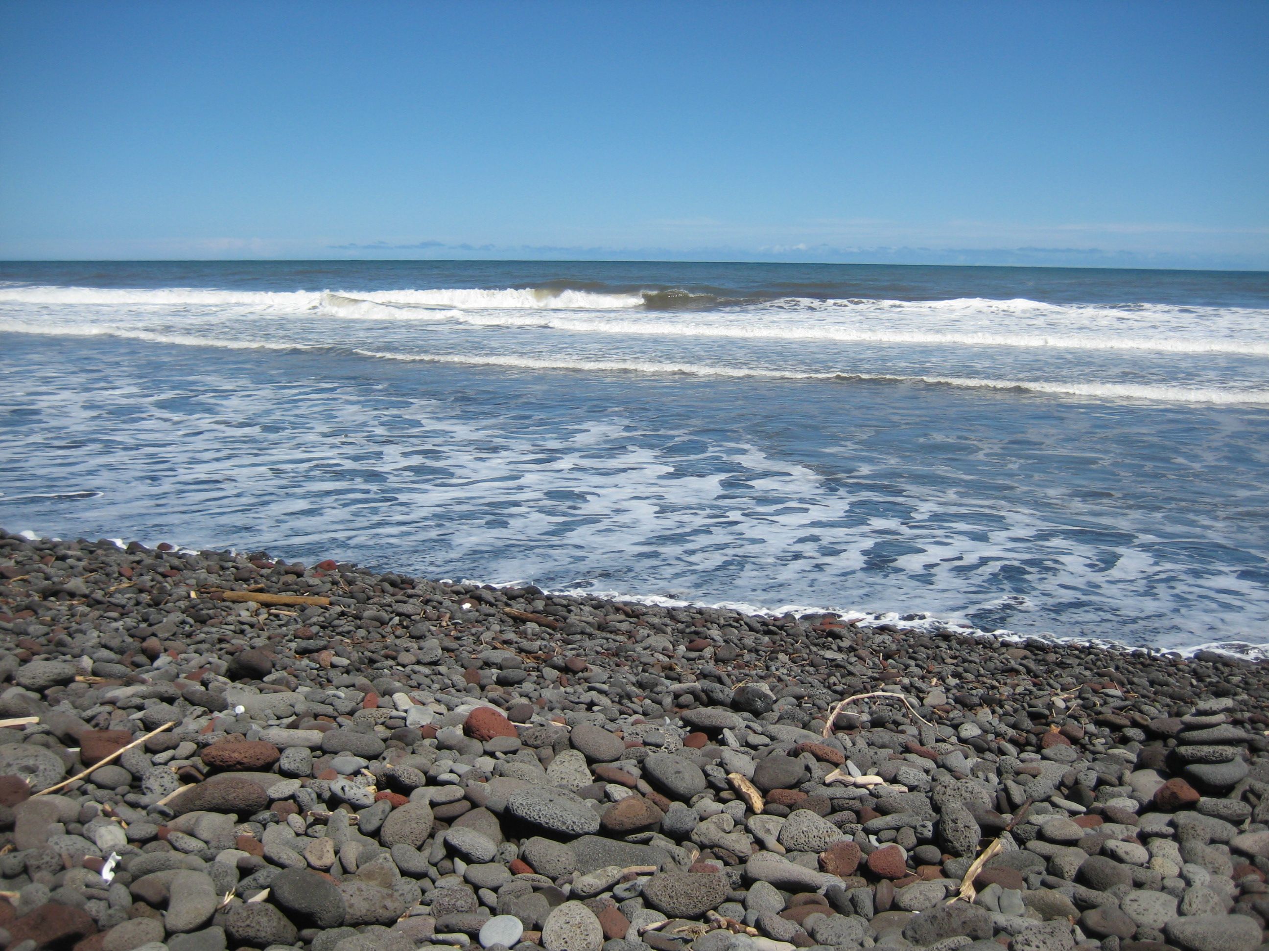 The beach is rocky, with rusting train tracks from a bridge that was destroyed in a 1949 Tsunami.