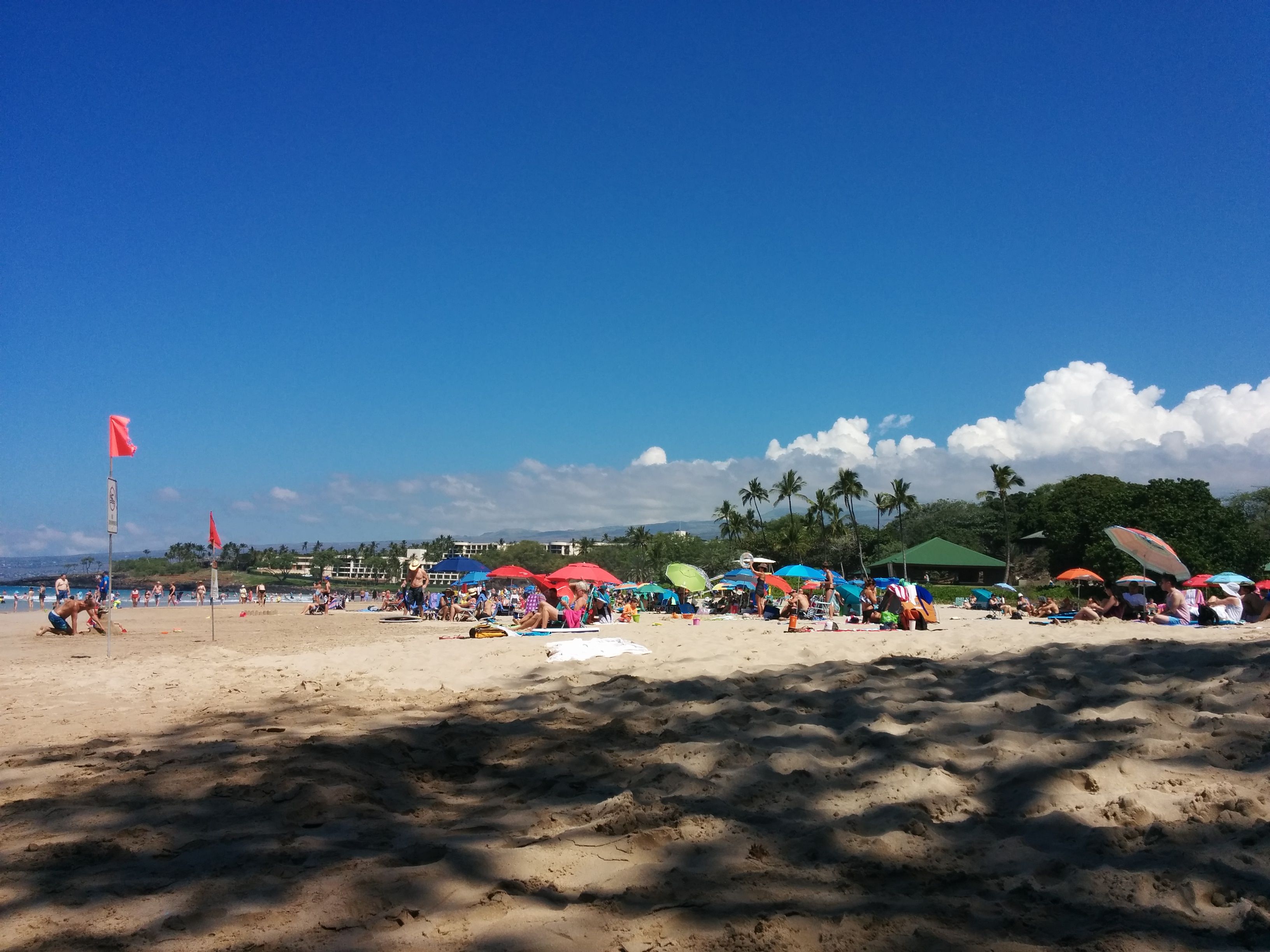 Beach day. Clear and beautiful all day. We eat a leisurely breakfast on the deck, then head for Hapuna beach, which is billed as "the perfect beach". We find shade at the far end of the beach. I climb some lava rocks. Y is in the ocean for a while and says it's strongly wavy. She has an encounter with a giant sea turtle.