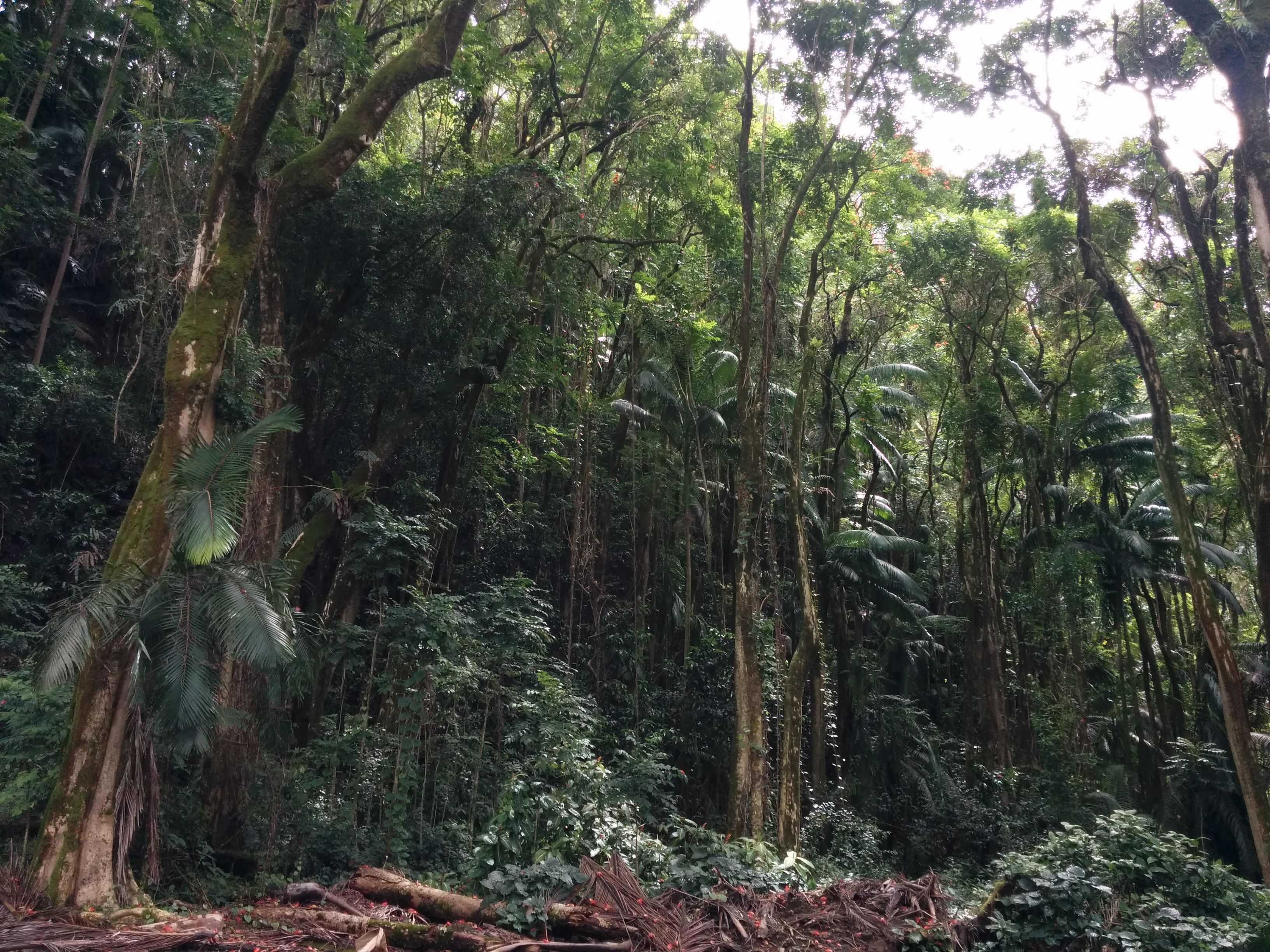 We skirt this and head up an absolutely gorgeous jungle trail. Y tries to befriend a trio of dim-witted Hawaiian jungle fowl.