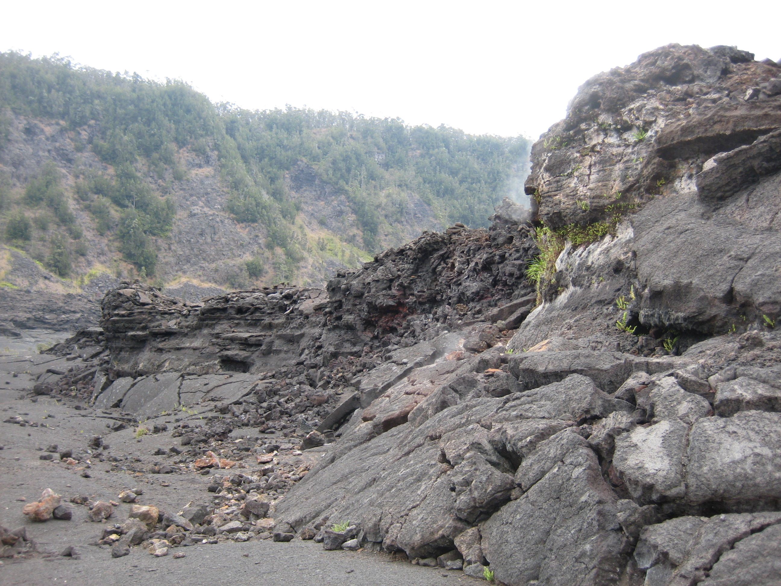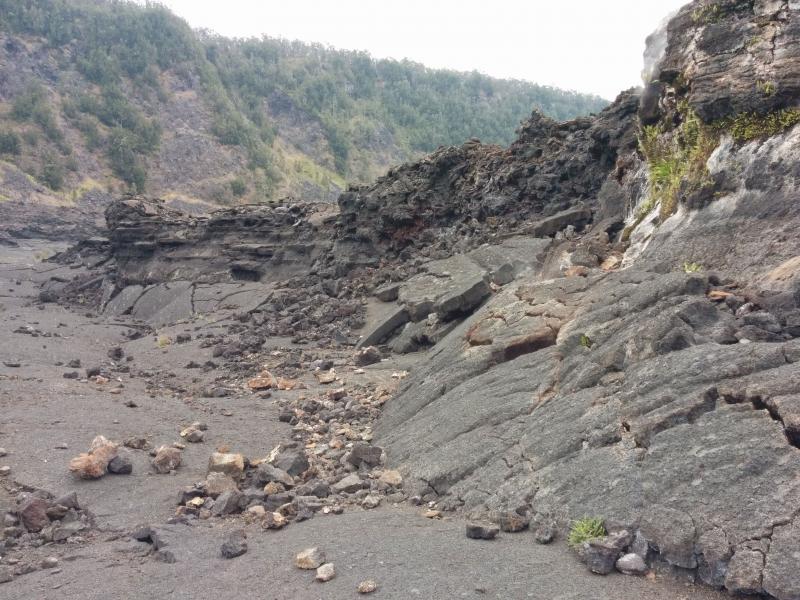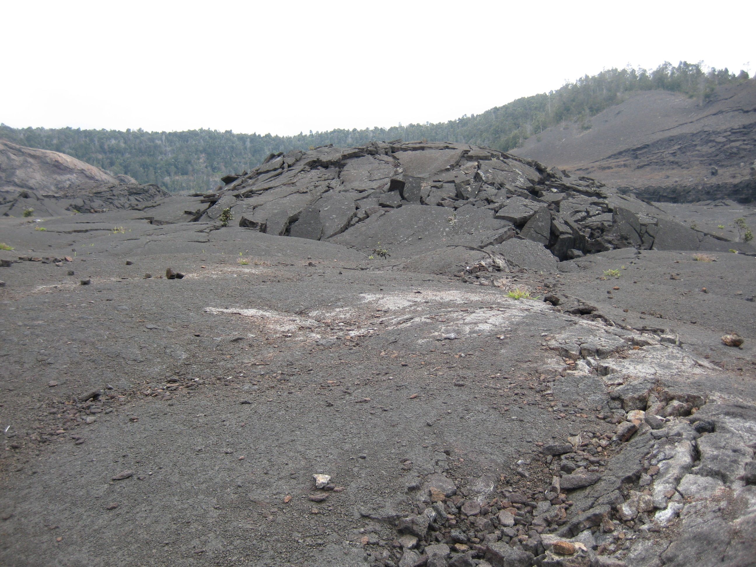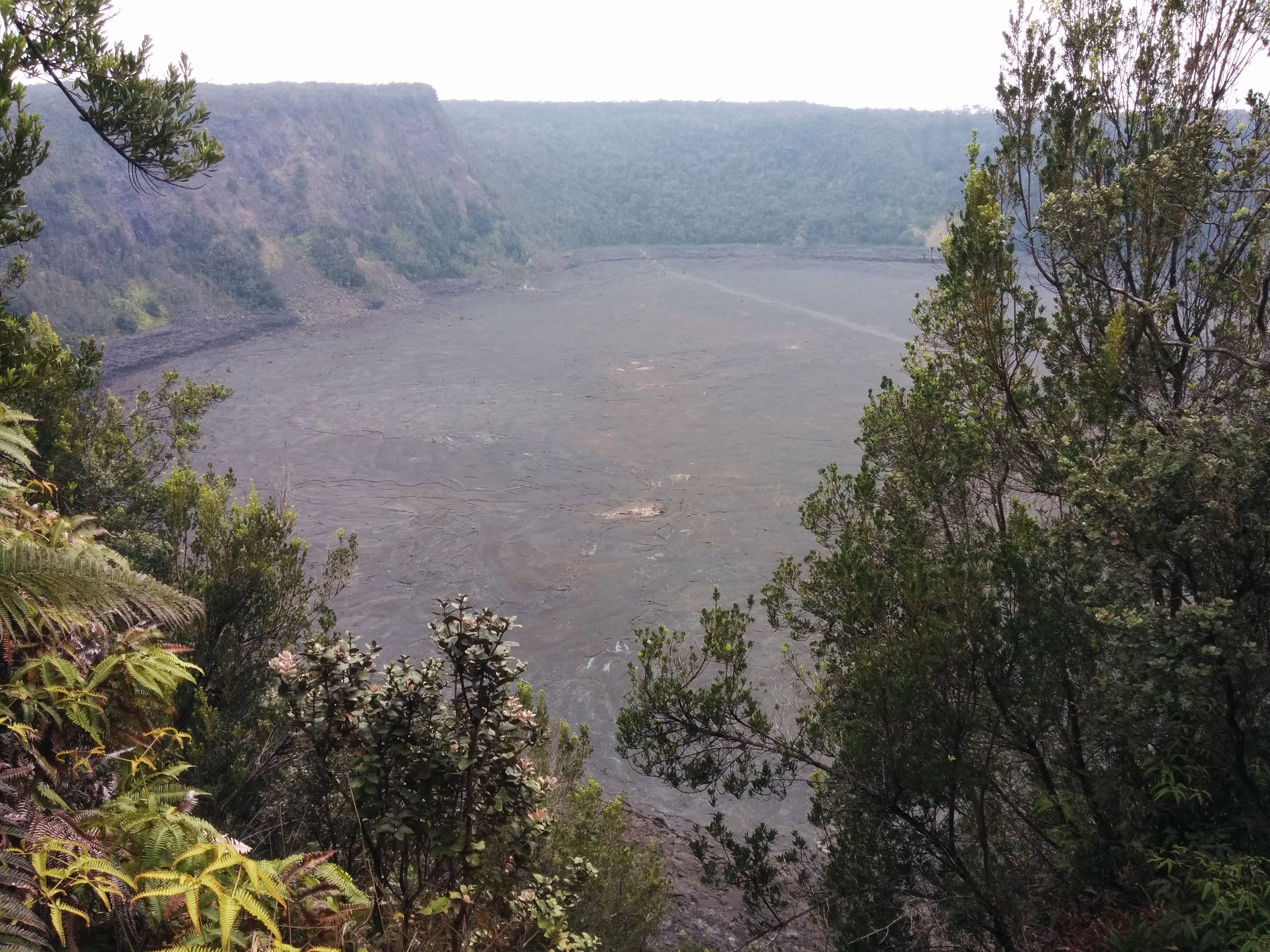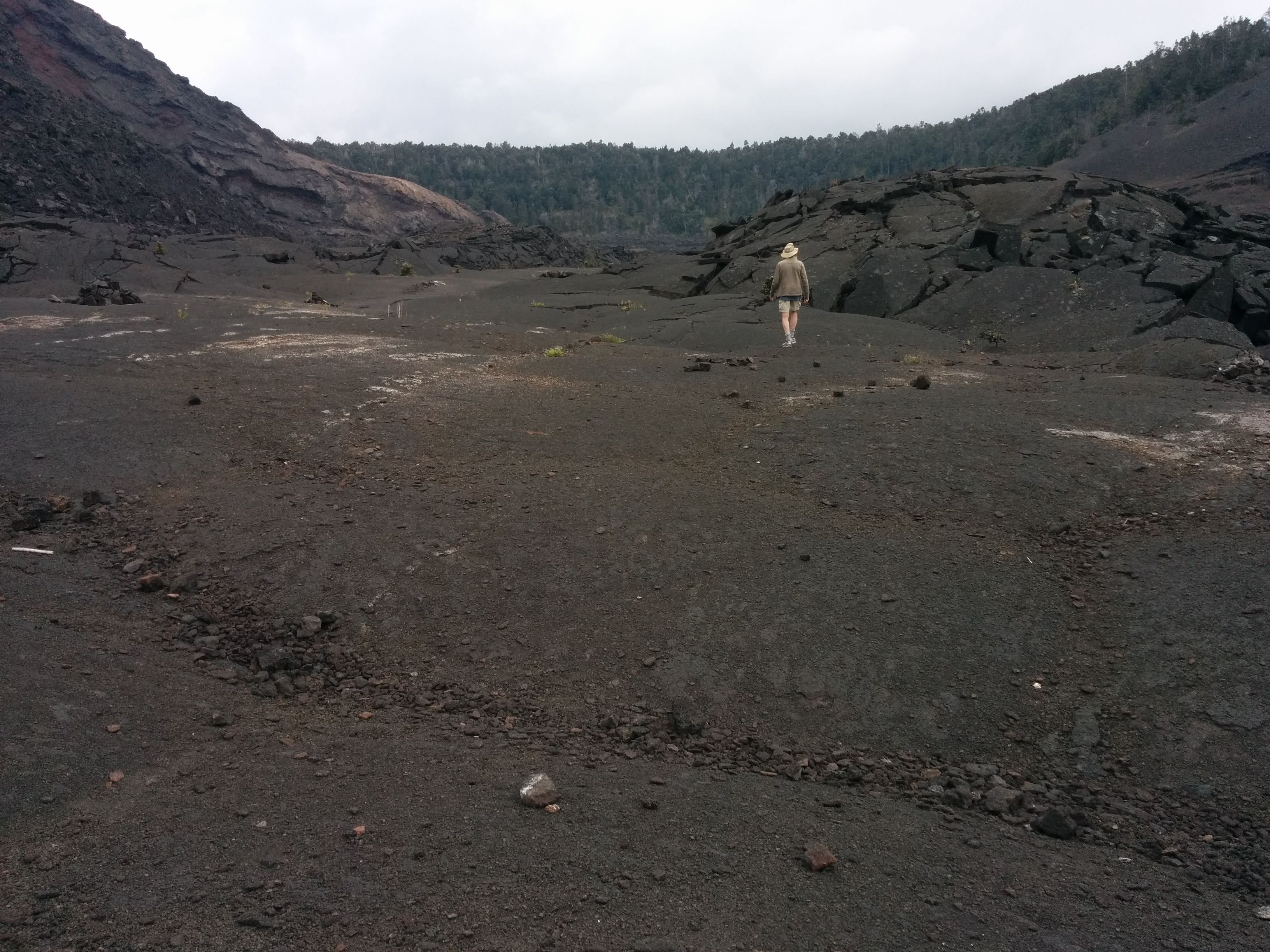 We arrive at the Volcano park and ask the rangerette for hiking recommendations. We do a hike that follows the Crater Rim trail to the Thurston Lava Tube (which we visit - worth it). Then we drop into the Kilawea Iki crater, which is entirely smooth but buckled lava from a flow in 1959. Occasional steam vents.